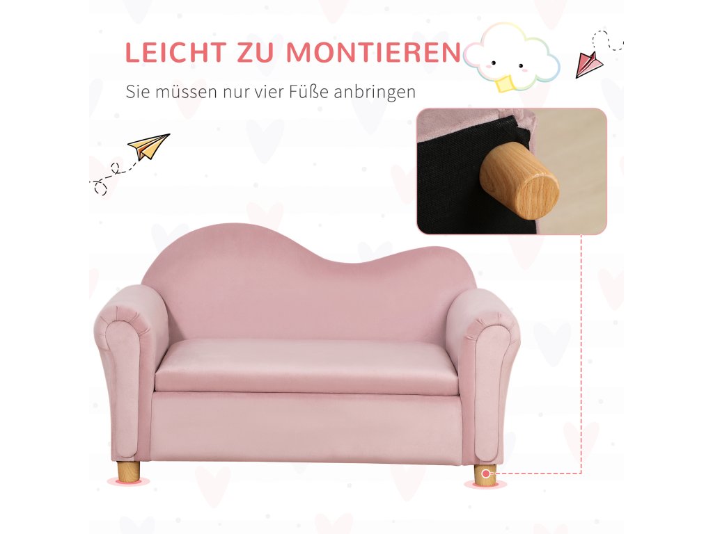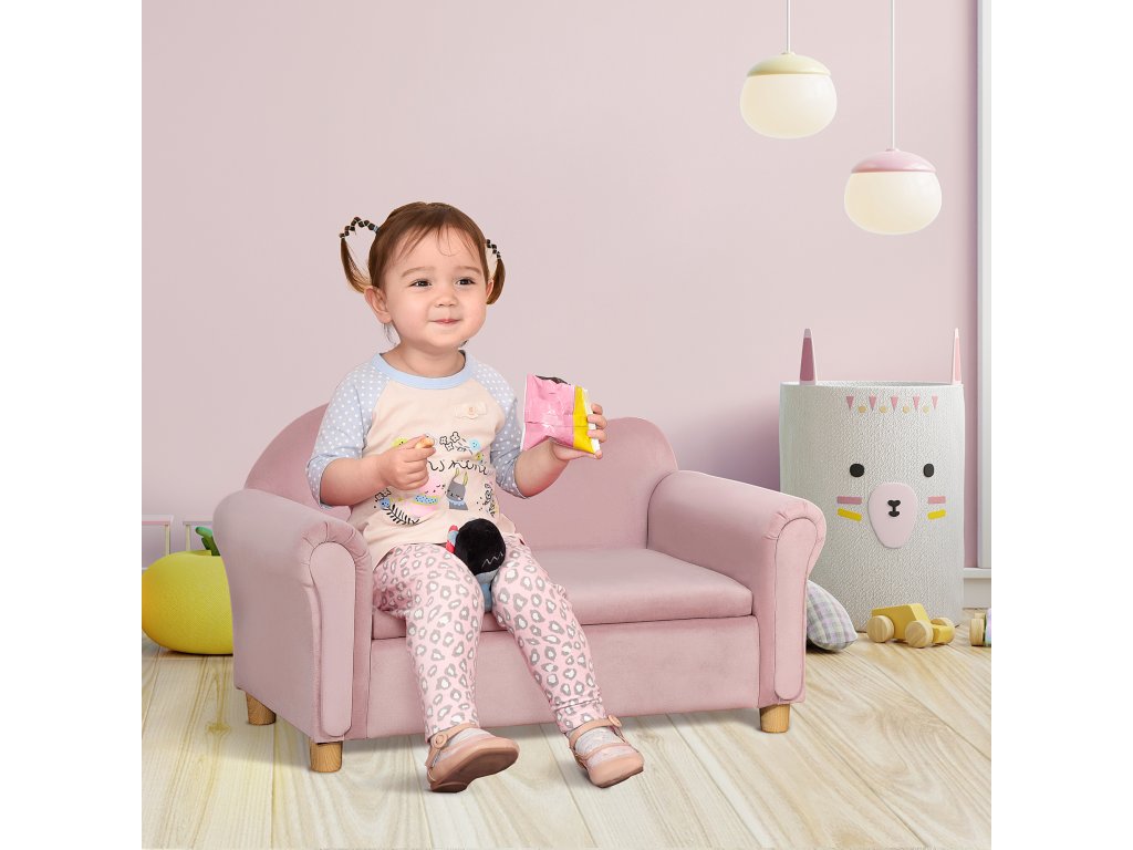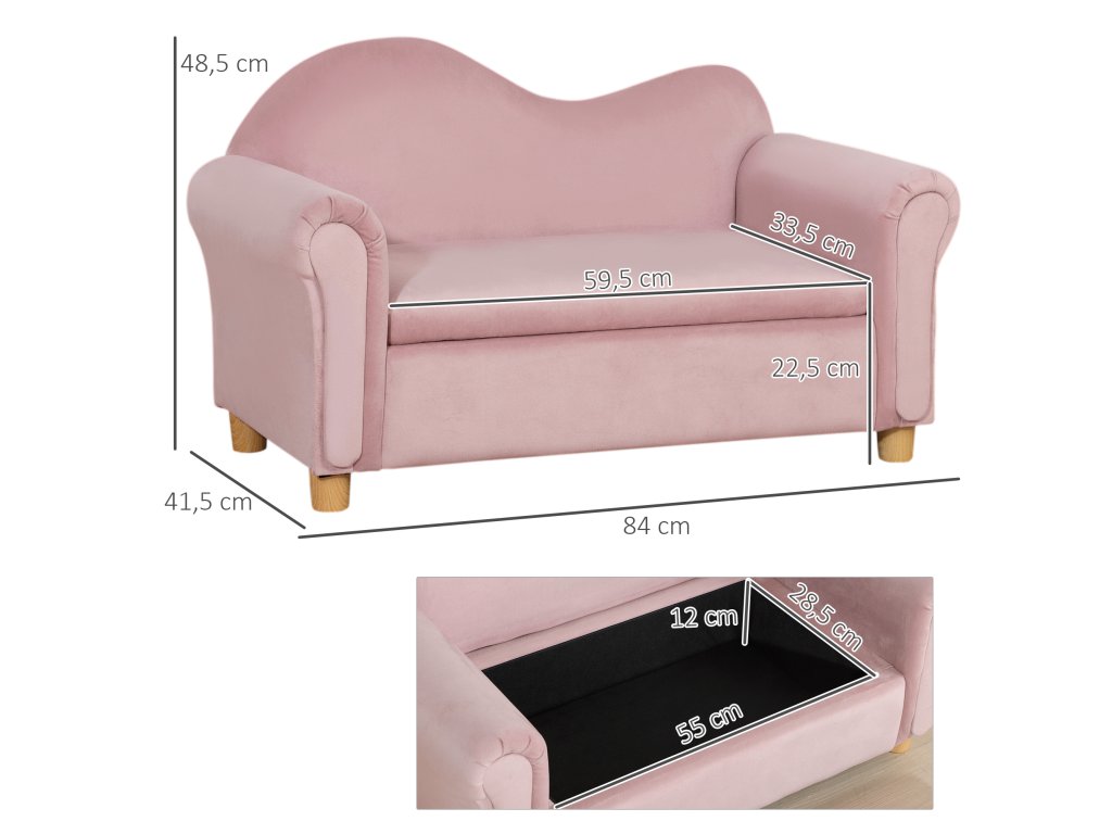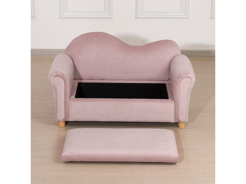 Dětská pohovka HOMCOM, dvoumístná, pro děti od 3 do 5 let, úložný prostor, rám z přírodního dřeva, 84 x 41,5 x 48,5 cm, růžová barva
