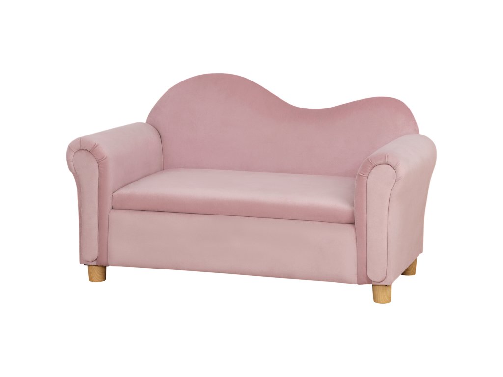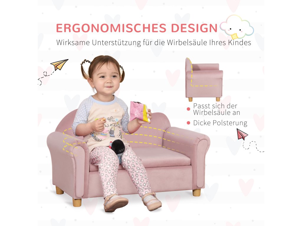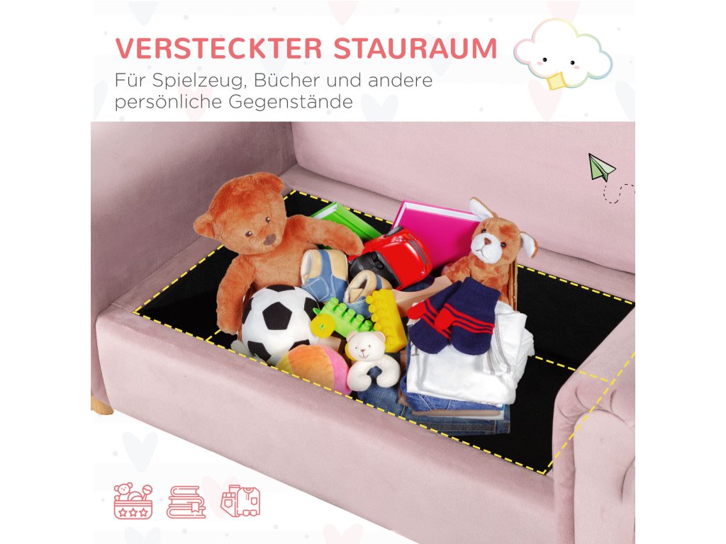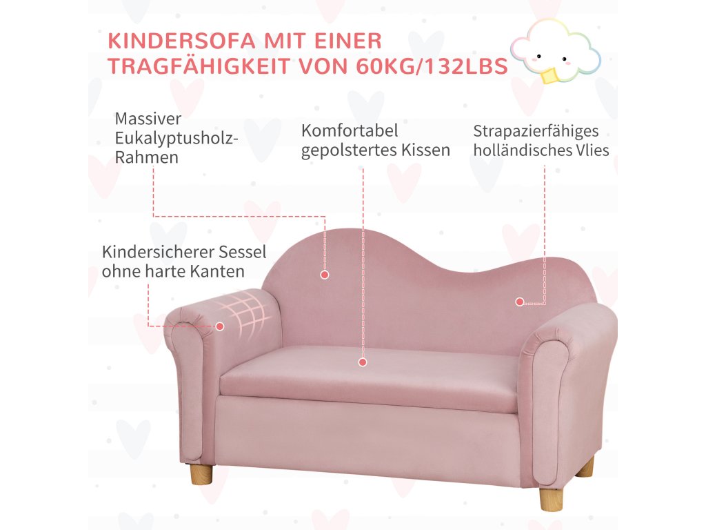 Dětská pohovka HOMCOM, dvoumístná, pro děti od 3 do 5 let, úložný prostor, rám z přírodního dřeva, 84 x 41,5 x 48,5 cm, růžová barva