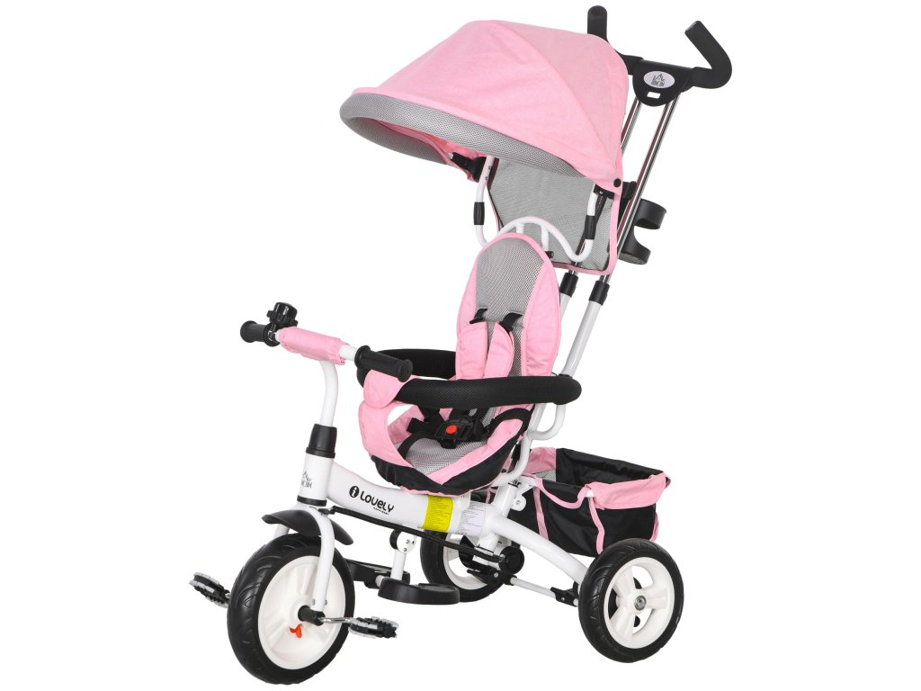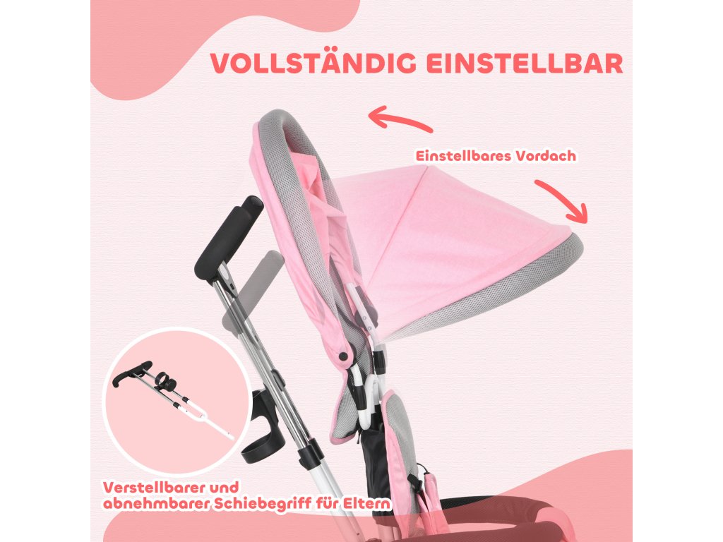 Dětská tříkolka HOMCOM 6 v 1 s odrážedlem, střechou, popruhy, úložným košíkem, pro děti od 1 do 5 let, růžová