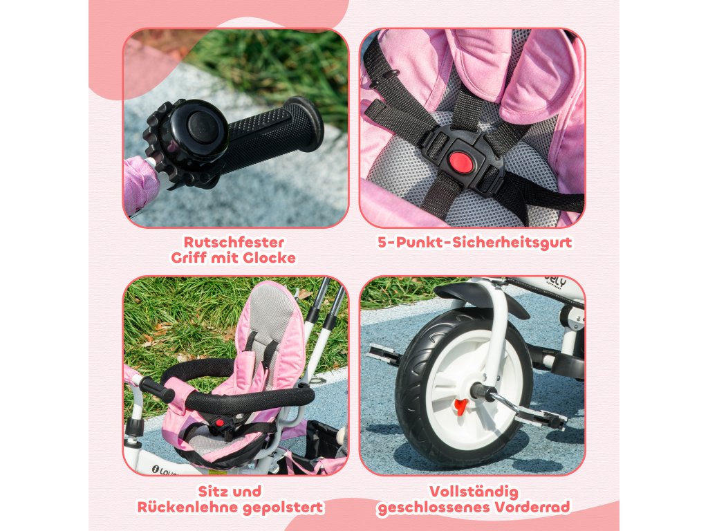 - Bezpečnost především: Díky odnímatelné bezpečnostní tyči, parkovací brzdě a 5bodovým bezpečnostním pásům nabízí tříkolka vašemu dítěti bezpečnou a příjemnou jízdu