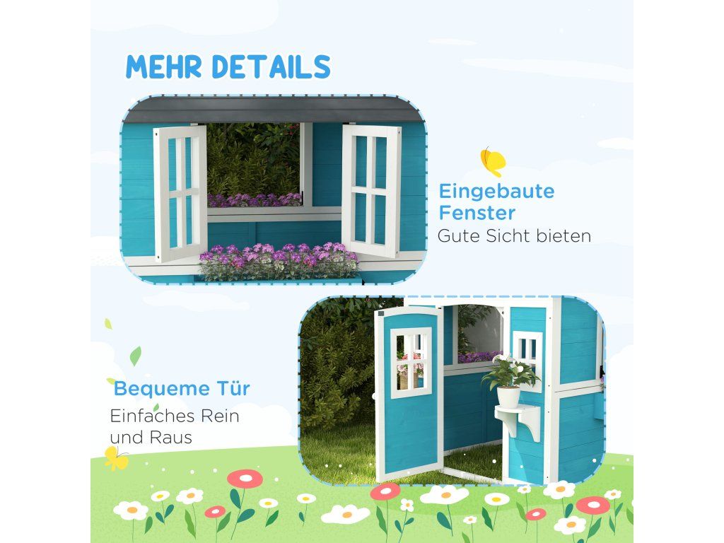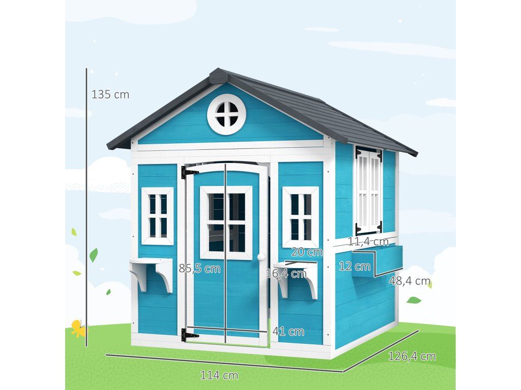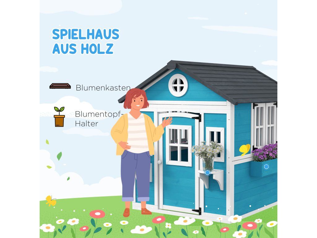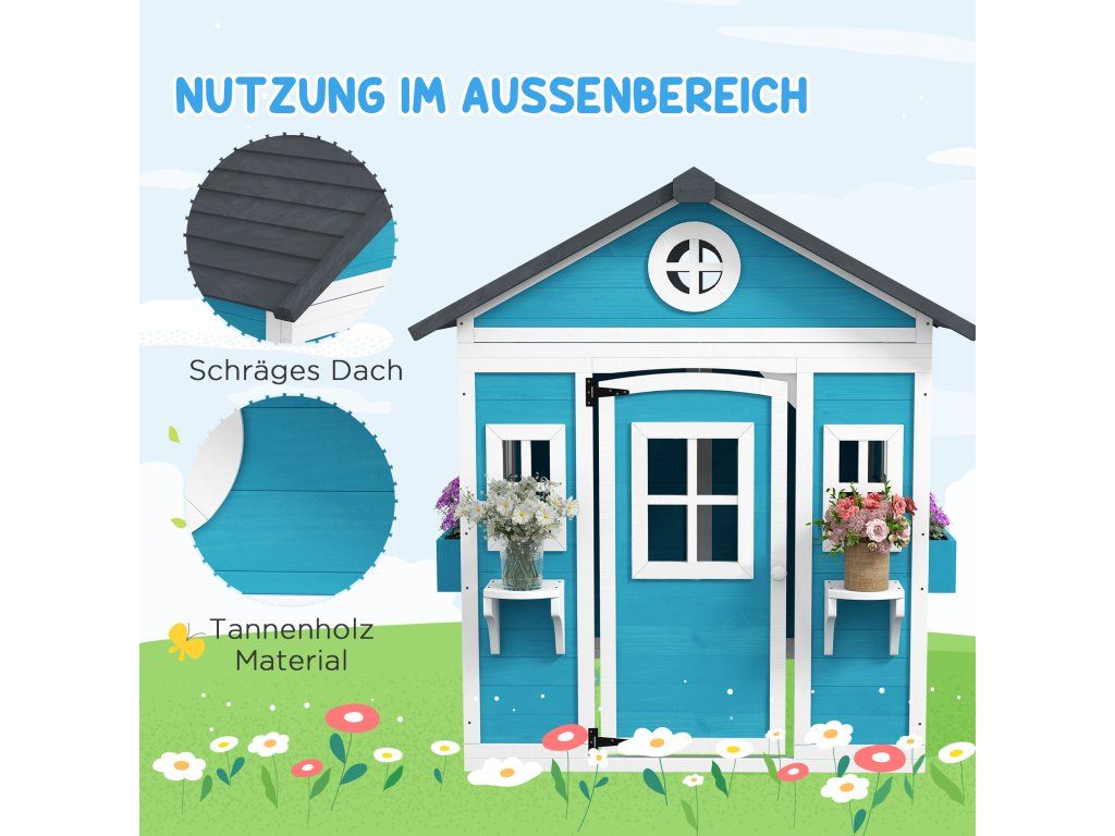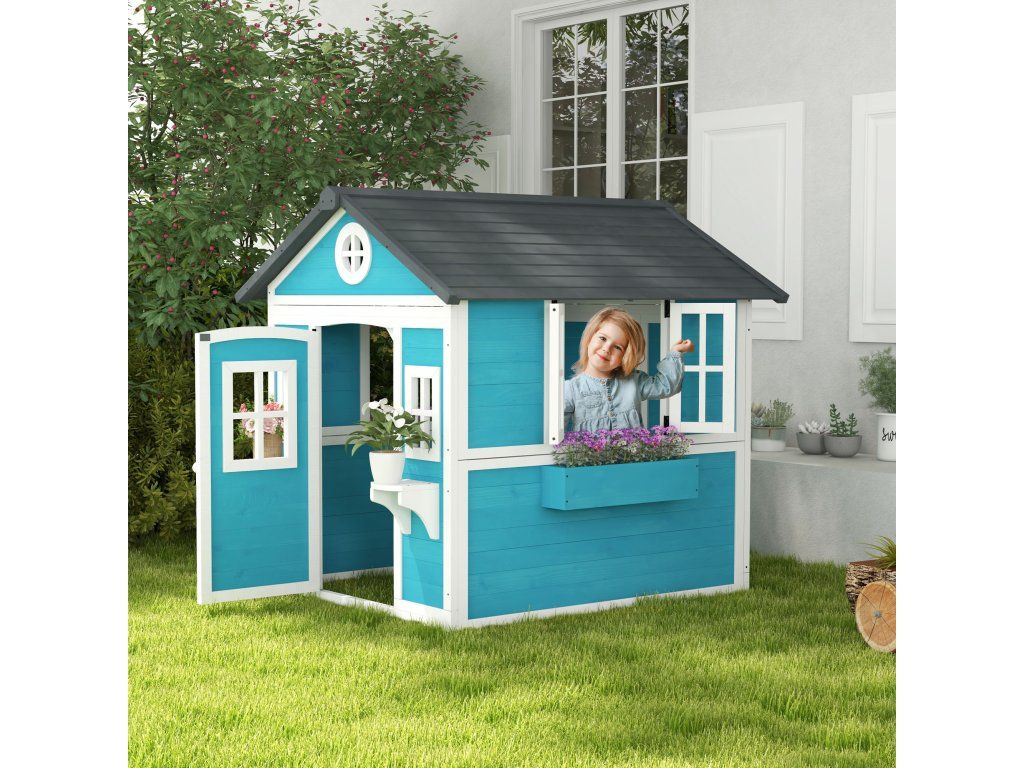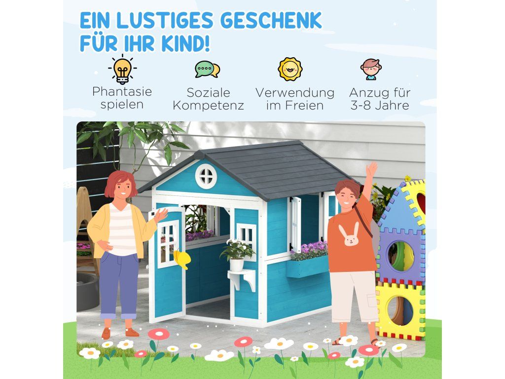 Dětský domeček Outsunny, dřevěný domeček pro děti, venkovní zahradní domeček s okny, květináče, 3-8 let, modrý