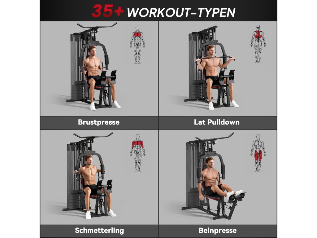 Komplexní možnosti tréninku: Díky stanici pro shyby, hrudníku s dvojitou akcí a leg press můžete provádět řadu cviků. Ideální pro efektivní trénink.