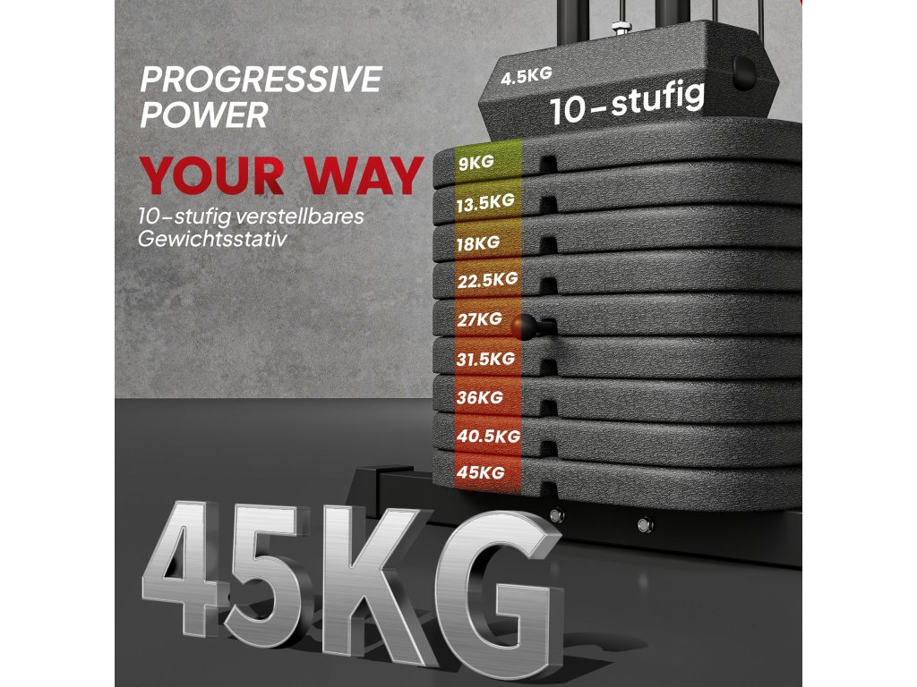 ✔ Zátěžové stohy 45 kg, nastavitelné pro různé úrovně dovedností