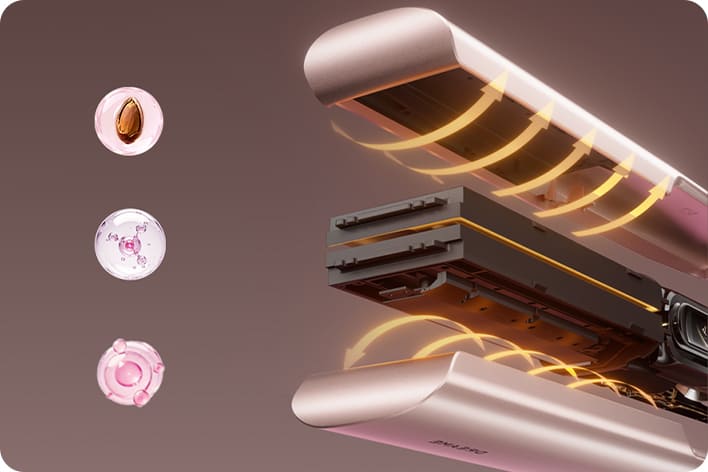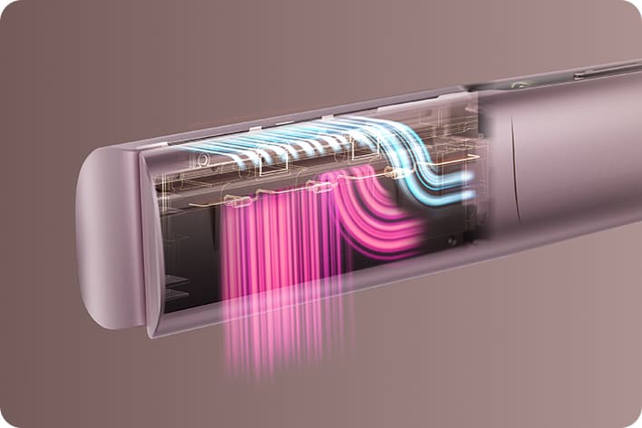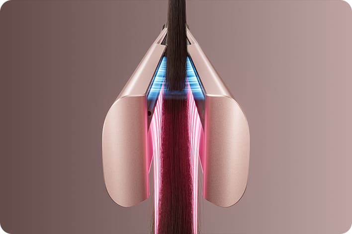 Dvojitý kanál proudění vzduchu směřuje cílený vzduch podél každého pramene a efektivně uhlazuje vlasy jedním tahem 3, čímžse snižuje potřeba extrémního tepla nebo nadměrného svírání.