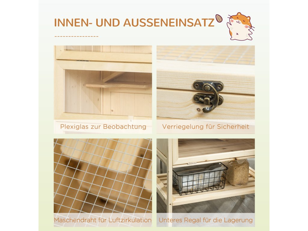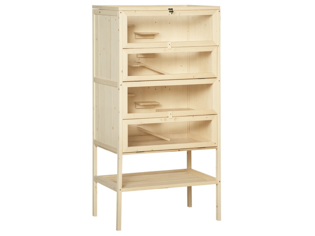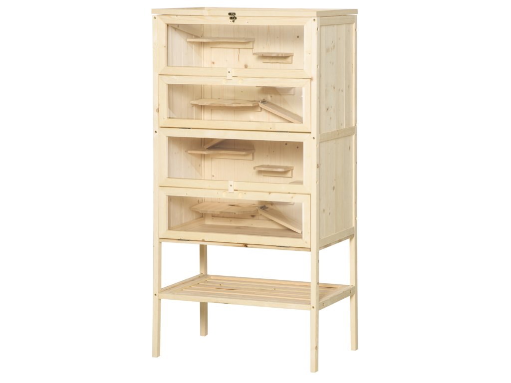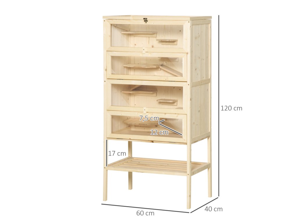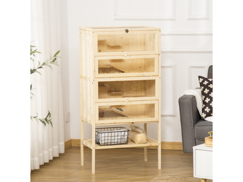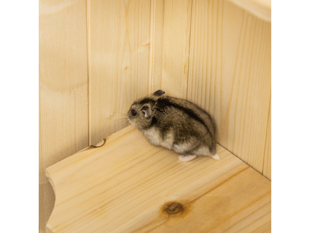 Tento krásný pětipatrový domov pro malé hlodavce od Pawhutu se skládá ze dvou samostatných prostor. Klec je vyrobena z jedlového dřeva a nabízí nejen dostatek prostoru, ale také spoustu aktivit pro obohacení. Víko s výklopnými panty je opatřeno drátěnou sítí pro dobré větrání a bezpečnost. Velké skleněné panely propouštějí do interiéru dostatek přirozeného světla. Boční okna a víko se také otevírají pro snadné čištění.