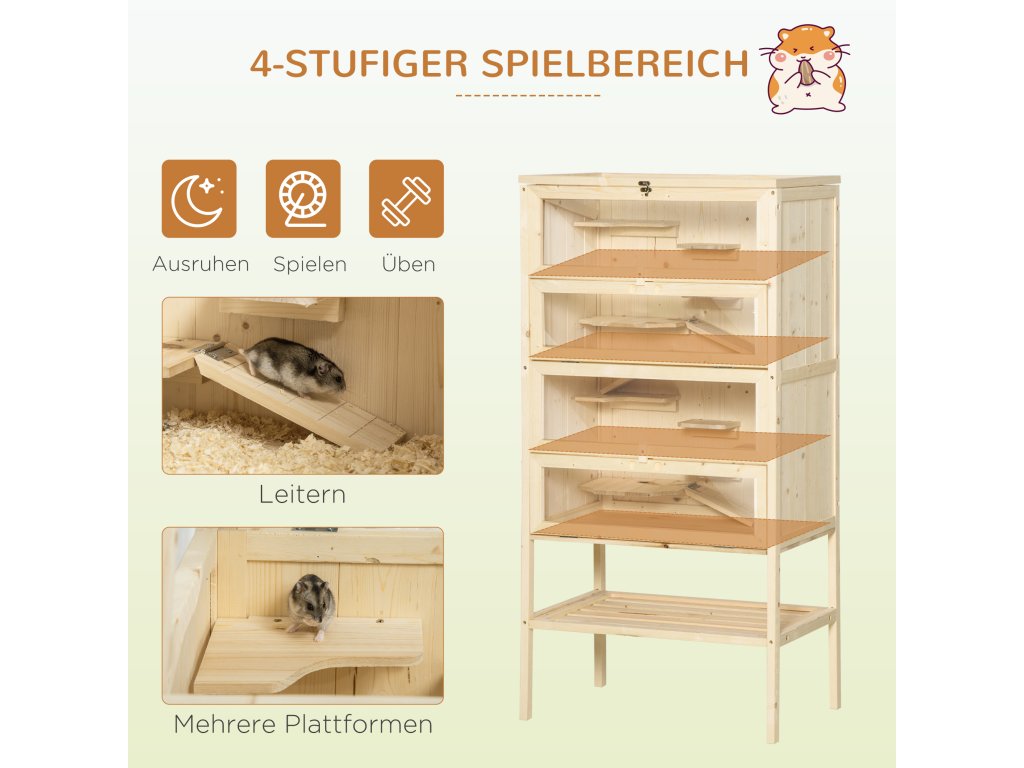 Dřevěná klec pro křečky PawHut, 5 úrovní, Rodenium, klec pro malá zvířata se síťovanou střechou a rampami, velká dřevěná klec pro křečky a zakrslé křečky, 60 x 40 x 120 cm, přírodní dřevo