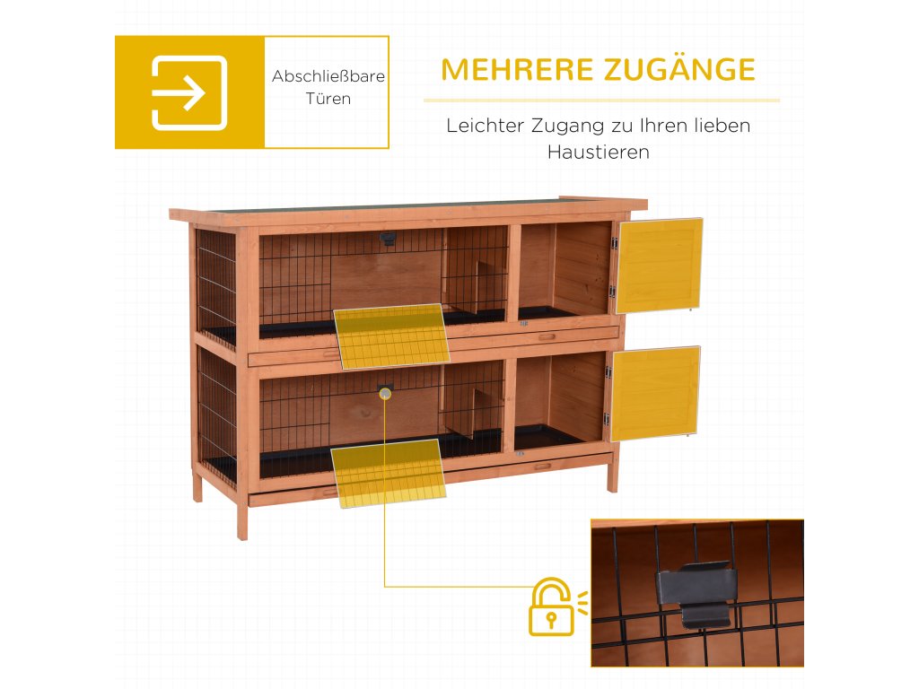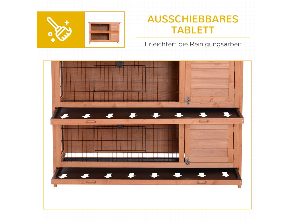 Naše dvoupatrová klec pro malá zvířata s oddělenými podlahami je ideální pro malá zvířata, jako jsou morčata. Je vyroben z pevného jedlového dřeva s vodoodpudivou úpravou. Díky tomu je kotec pro malá zvířata vhodný nejen pro vnitřní, ale i venkovní použití. Chcete-li vyčistit box, můžete jednoduše vyjmout základny misek a snadno je doplnit podestýlkou pro malá zvířata nebo senem. Ideální domov pro vaše malá zvířátka.
