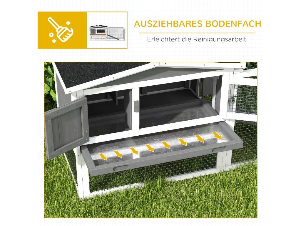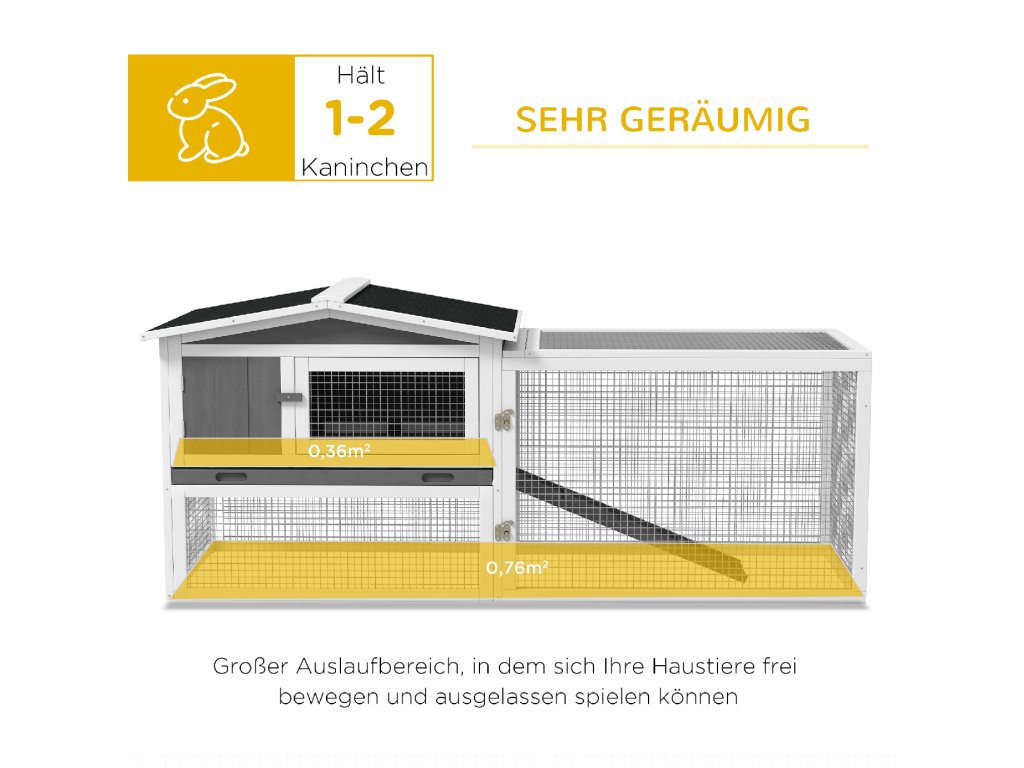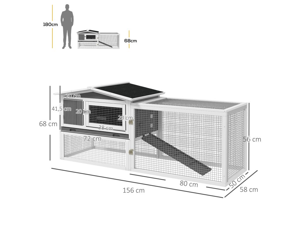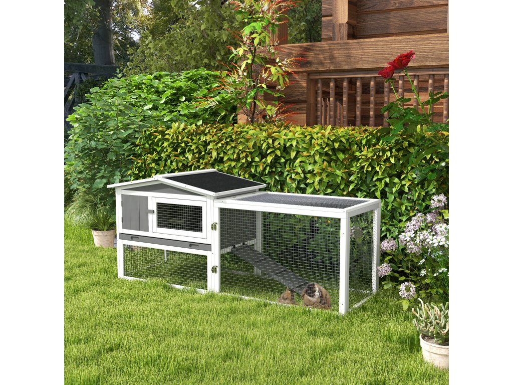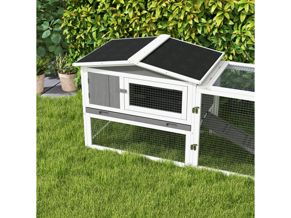 Tato prostorná králíkárna PawHut pro zakrslé králíky je ideální také pro morčata a menší zvířata. Hlavní budova i přilehlá klec nabízejí na dvou úrovních dostatek prostoru pro hraní a odpočinek. Voděodolné stěny a robustní železné dráty kotce pro malá zvířata chrání před povětrnostními vlivy a většími zvířaty. Dopřejte svým malým chlupatým kamarádům prostor, který potřebují.