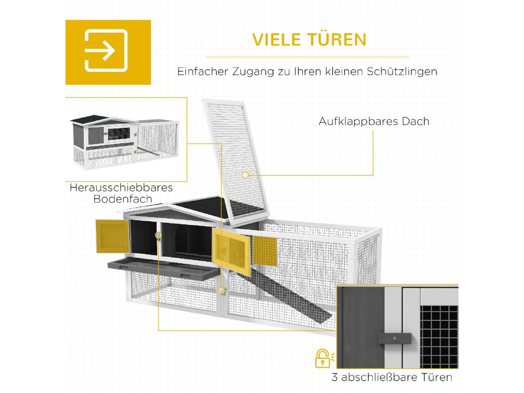 Promyšlený design: Rampa spojuje obývací pokoj s venkovním výběhem a usnadňuje přístup. Uzamykatelné dveře pro snadný vstup a výstup zajišťují bezpečnost vašeho mazlíčka. Síťované okénko v přiložené kleci pro malá zvířata vám umožní snadněji pozorovat vašeho mazlíčka