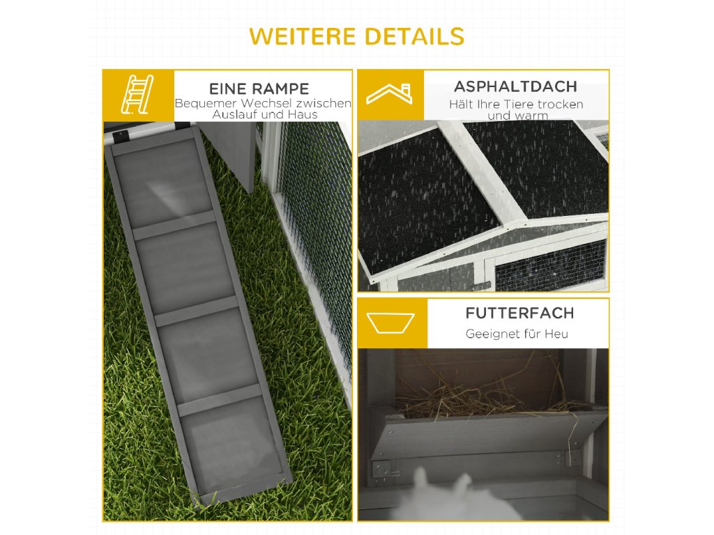 ✔ Voděodolný nátěr a asfaltová střecha výběhu pro malá zvířata chrání před dešťovou vodou a dalšími povětrnostními vlivy