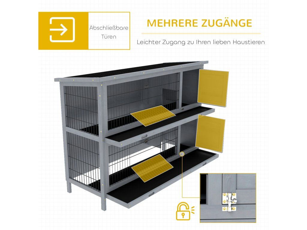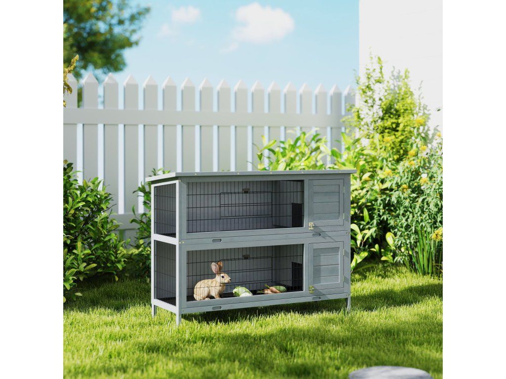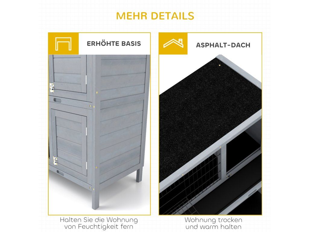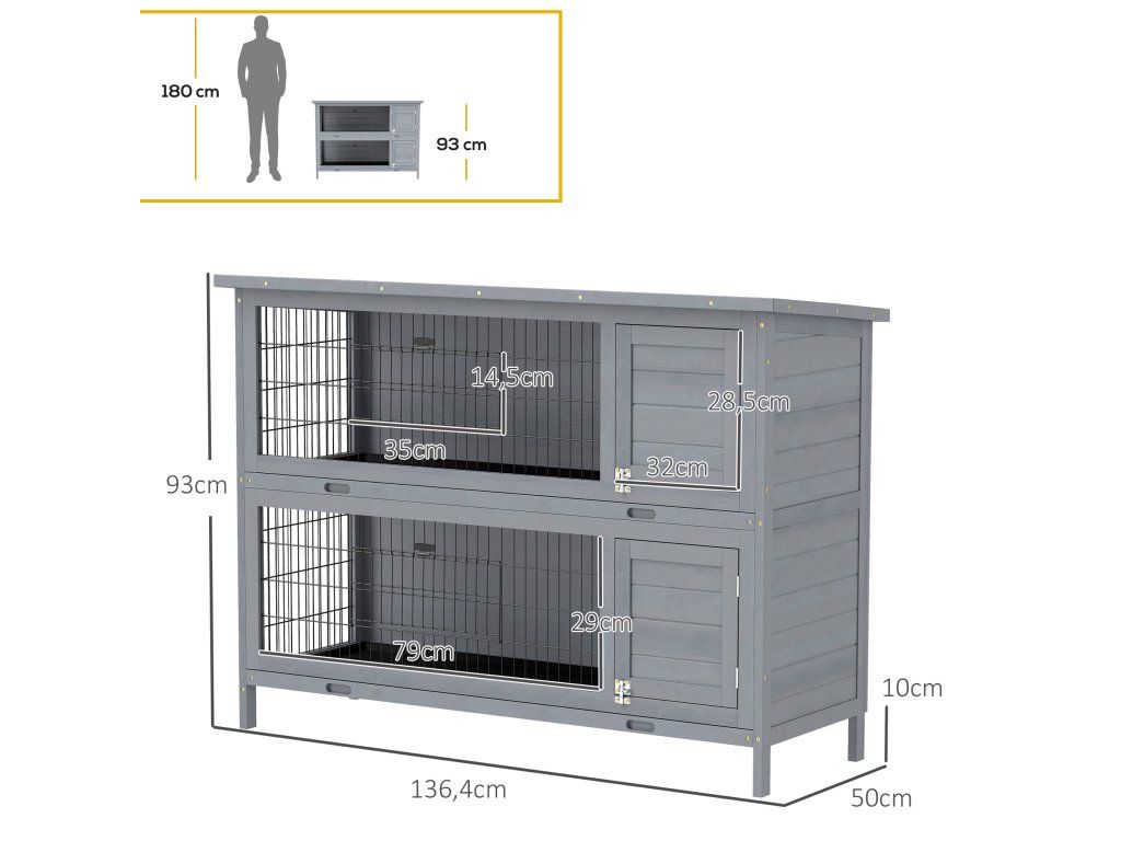 Dřevěná králíkárna PawHut se 2 úrovněmi, asfaltovou střechou, spodním tácem, dvířky pro malá zvířata, 136,4 x 50 x 93 cm, šedá