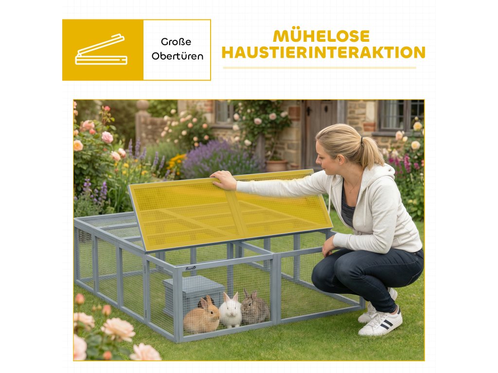 Snadná interakce s vaším mazlíčkem: Díky dvěma velkým dvířkům v horní části králíkárny můžete svého mazlíčka snadno hladit, krmit a čistit – každodenní péče se tak stane jednoduchým a příjemným zážitkem, který posiluje pouto s vaším milovaným společníkem.