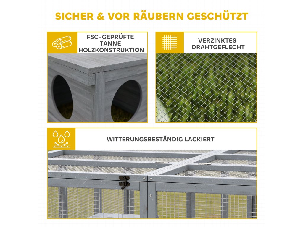 Bezpečné a odolné proti predátorům: Vyrobeno z robustního rámu z jedlového dřeva s certifikací FSC a odolného drátěného pletiva 12 x 12 mm, které zabraňuje útěku. Robustní zámky poskytují spolehlivou ochranu před predátory, takže se můžete uvolnit s vědomím, že vaši mazlíčci jsou v bezpečí.