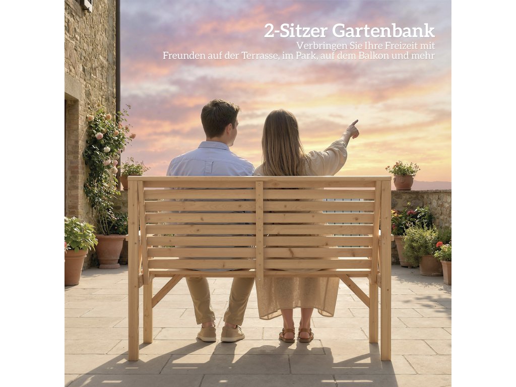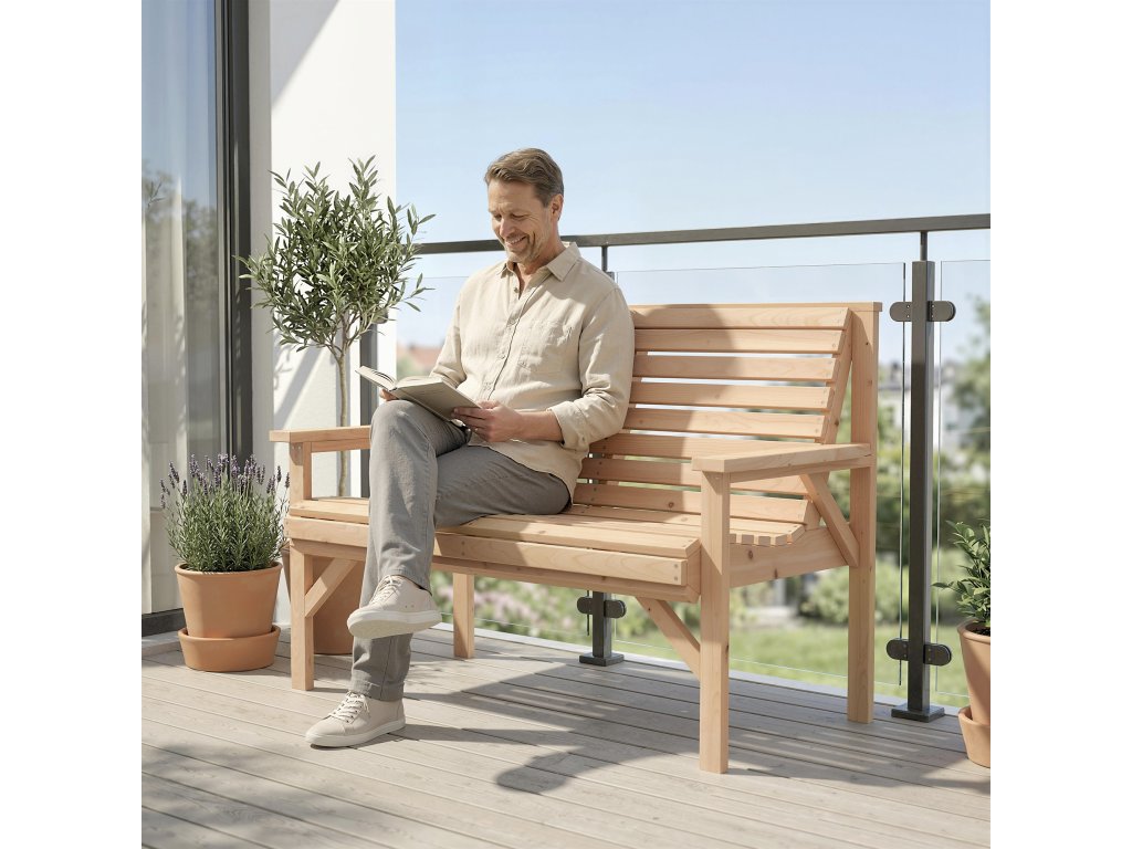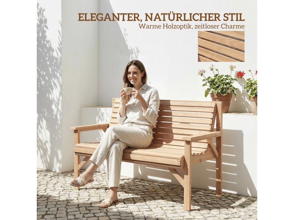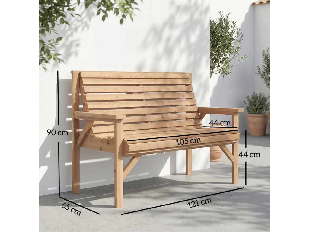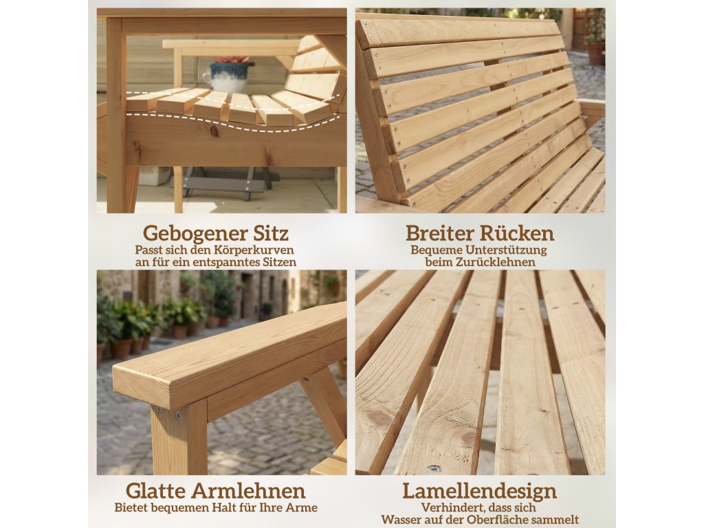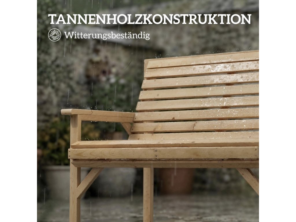 Pevná konstrukce: Tato zahradní lavice vyrobená z odolného jedlového dřeva unese až 260 kg a nabízí stabilní sezení. Ideální pro relaxační chvíle s rodinou a přáteli – spolehlivý kus nábytku, který lze na zahradě používat po celý rok.