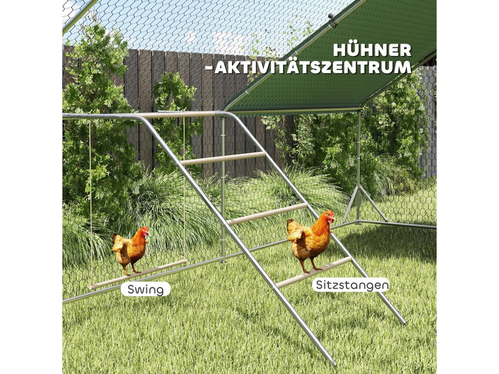- Centrum zábavy: Čtyři robustní hrazdy pro kuřata a nastavitelná houpačka hracího rámu pro kuřata poskytují ptákům dynamické místo k setkávání, které podporuje zdravé návyky a zajišťuje pohodový pobyt na vaší zahradě.