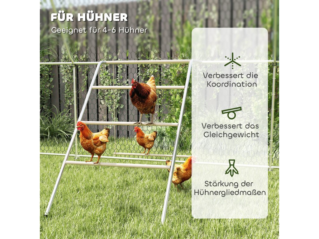 Cítí se vaše kuřata na zahradě stísněně a ve stresu? Víceúrovňový hrací rám PawHut promění váš stávající výběh v centrum aktivit. Hrací koutek pro kuřata je vybaven čtyřmi stupňovitými hřady a houpačkou, vytváří dostatek prostoru až pro šest kuřat a poskytuje klidné, hravé prostředí.