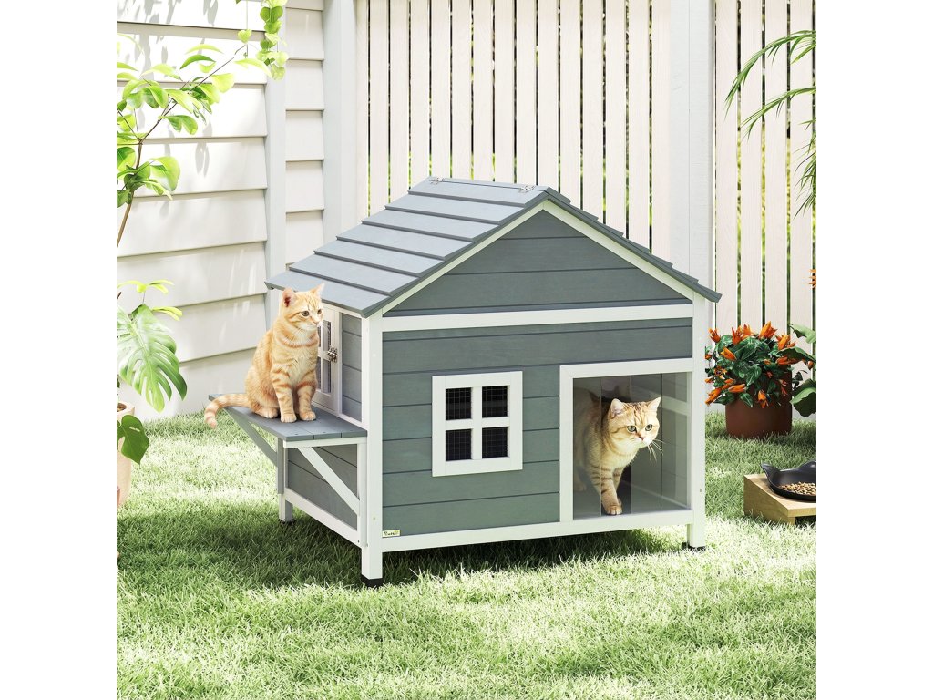 Dřevěný kočičí domek PawHut, dvoupatrový kočičí domek s vodotěsnou výklopnou střechou, boční plošina, 101x72,5x81cm, šedý