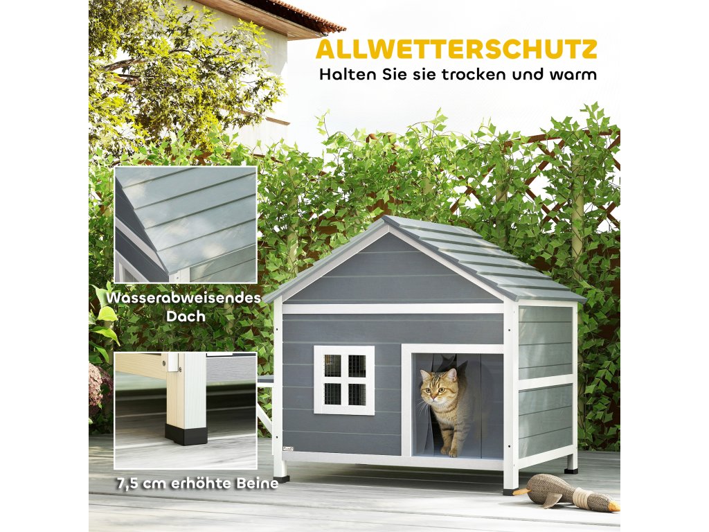 ✔ Zvýšená konstrukce s voděodolnou střechou chrání vaše kočky před deštěm a udržuje je v teple venku