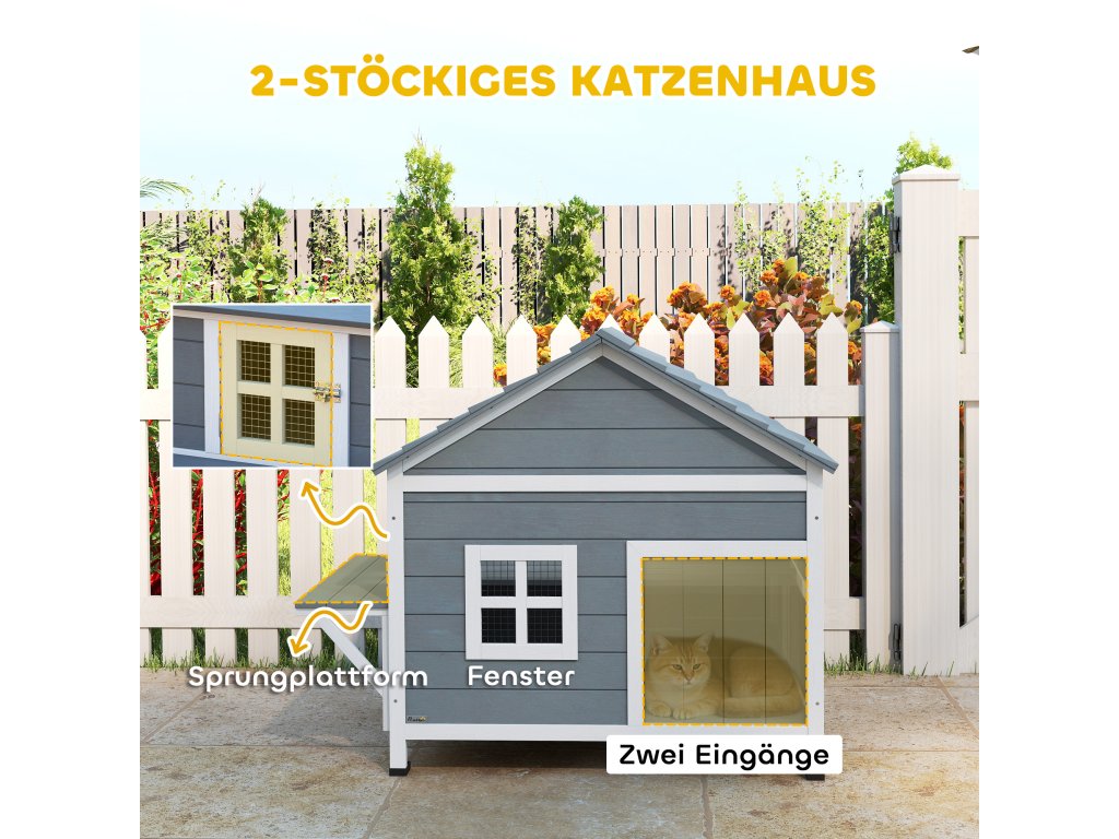 Dvoupatrové zábavné útočiště: Venkovní kočičí domek se dvěma úrovněmi, každá se dvěma vchody, ideální pro relaxaci 1-2 koček. Má 60cm boční plošinu, ideální pro opalování a snadný přístup do zahrady.