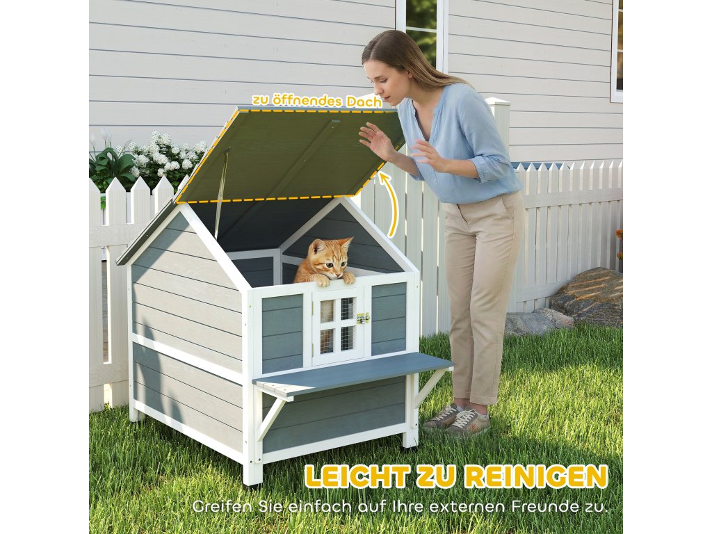 Snadné čištění a interakce: Střecha venkovního kočičího domku se otevírá nahoru, což usnadňuje čištění a interakci, udržuje jej svěží a umožňuje vám trávit kvalitní čas se svými kočkami.