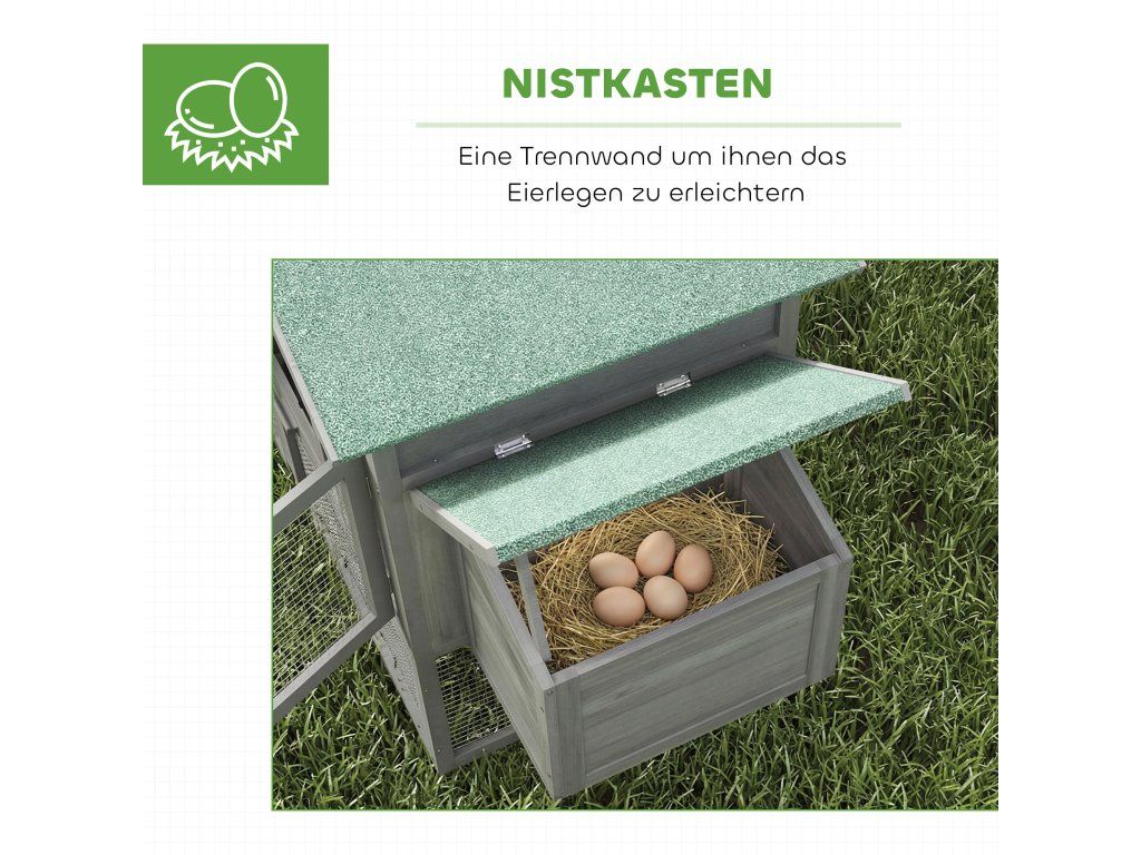 Ochrana proti povětrnostním vlivům: Robustní dřevěný rám s vodotěsným nátěrem a asfaltová střecha chrání kurník před deštěm a povětrnostními vlivy. Odolné kovové pletivo poskytuje bezpečnost tím, že chrání vaše kuřata a zároveň brání vniknutí predátorů.