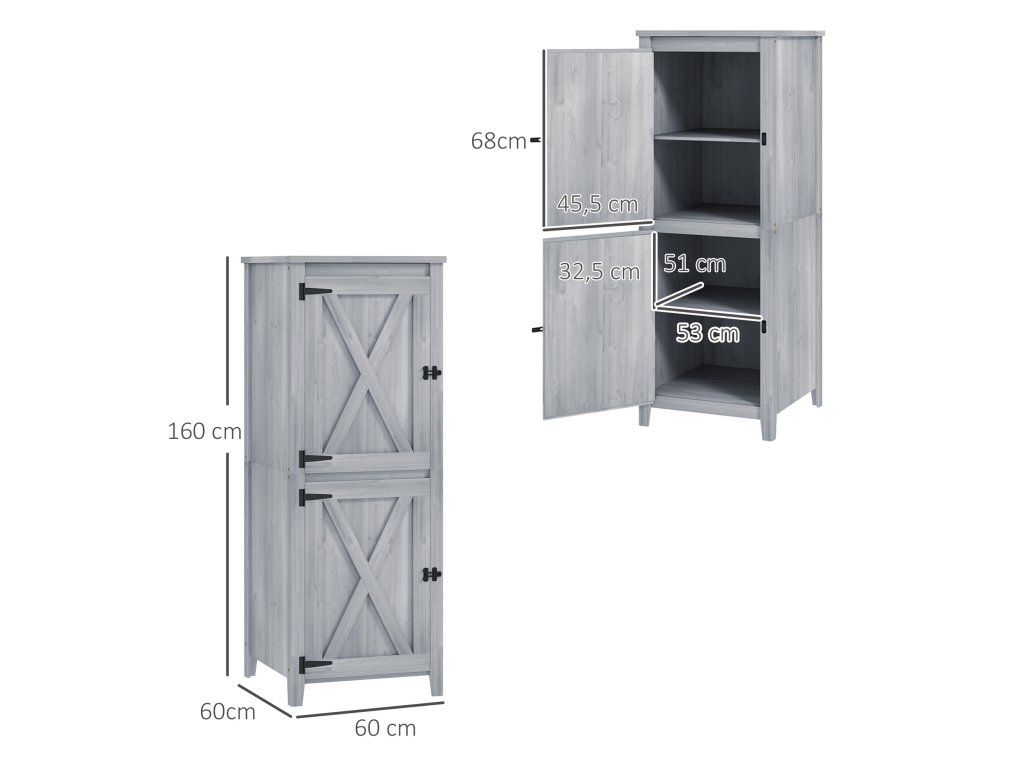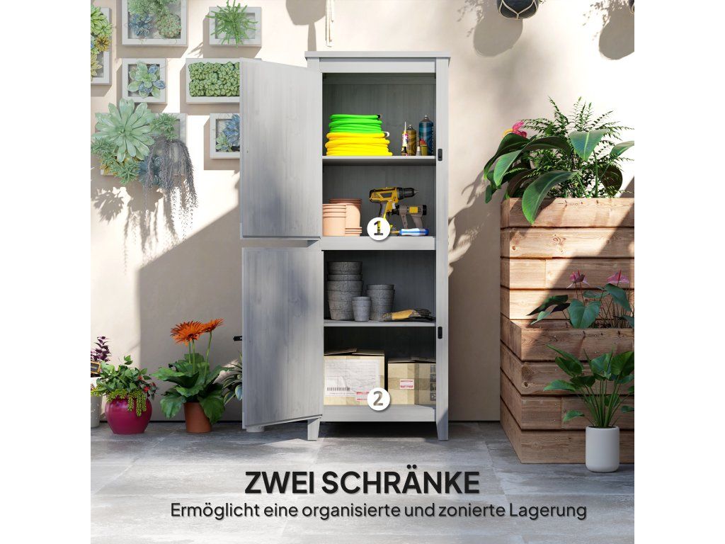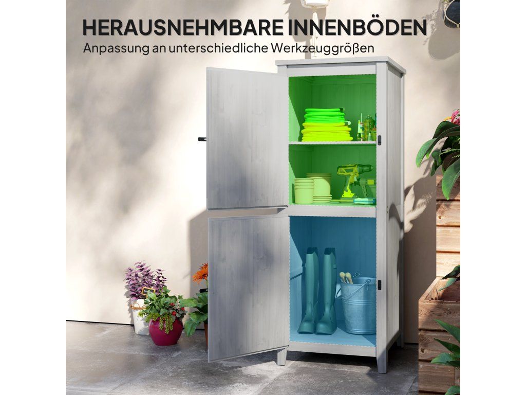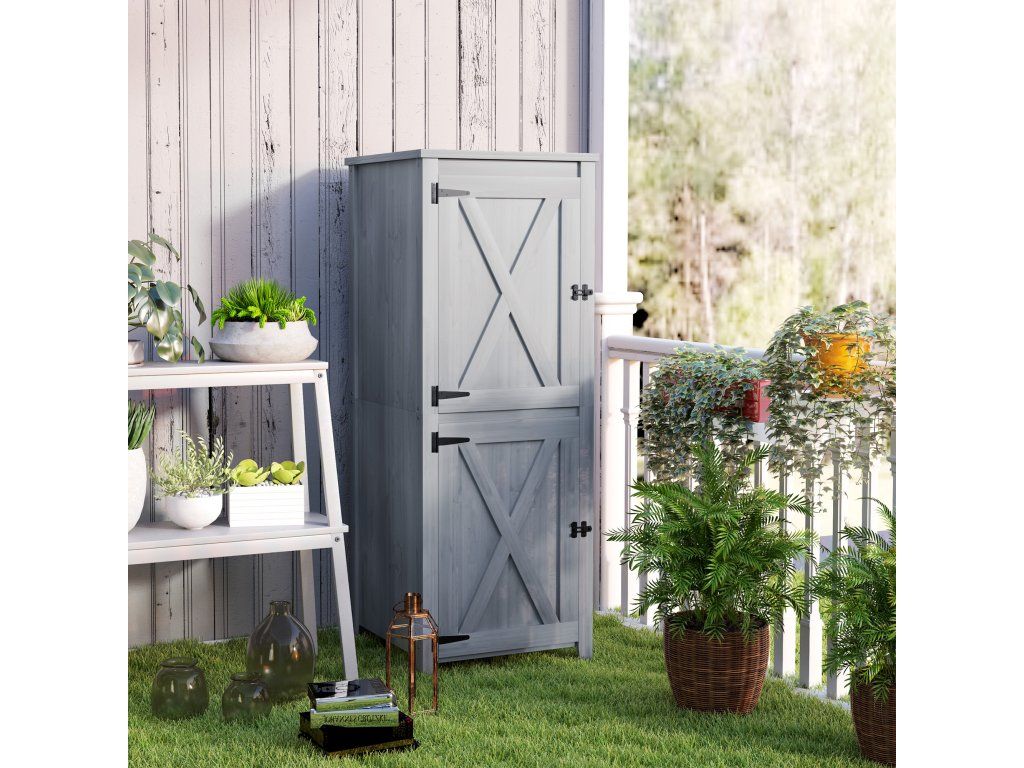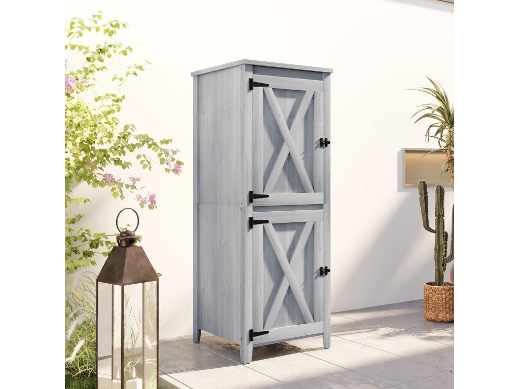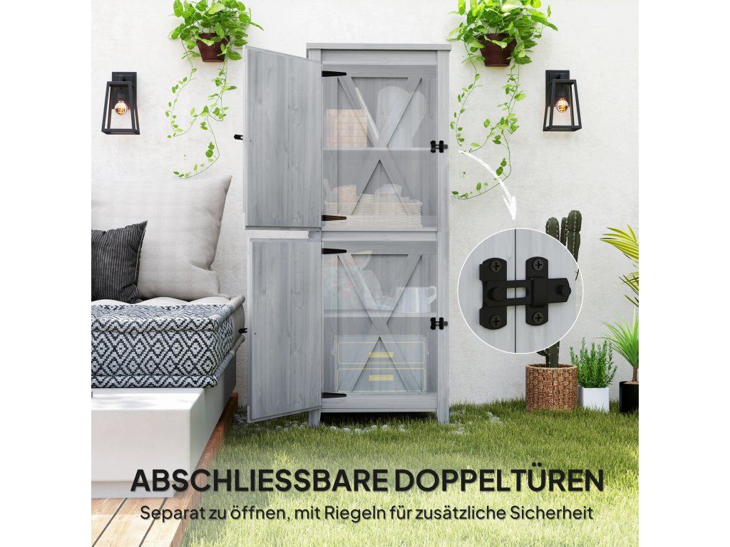 Dřevěný přístřešek Outsunny, kompaktní zahradní přístřešek na nářadí a zahradní techniku s uzamykatelnými dveřmi, světle šedý
