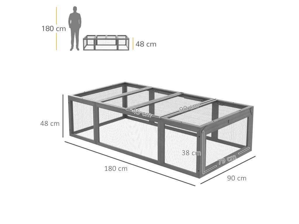 Údaje o produktu pro ohradu pro malá zvířata: Celkové rozměry: 180 D x 90 Š x 48 V cm, horní dveře (jednoduché): 45 D x 90 Š cm. Rozměry bočních dveří: 79D x 38Š cm.