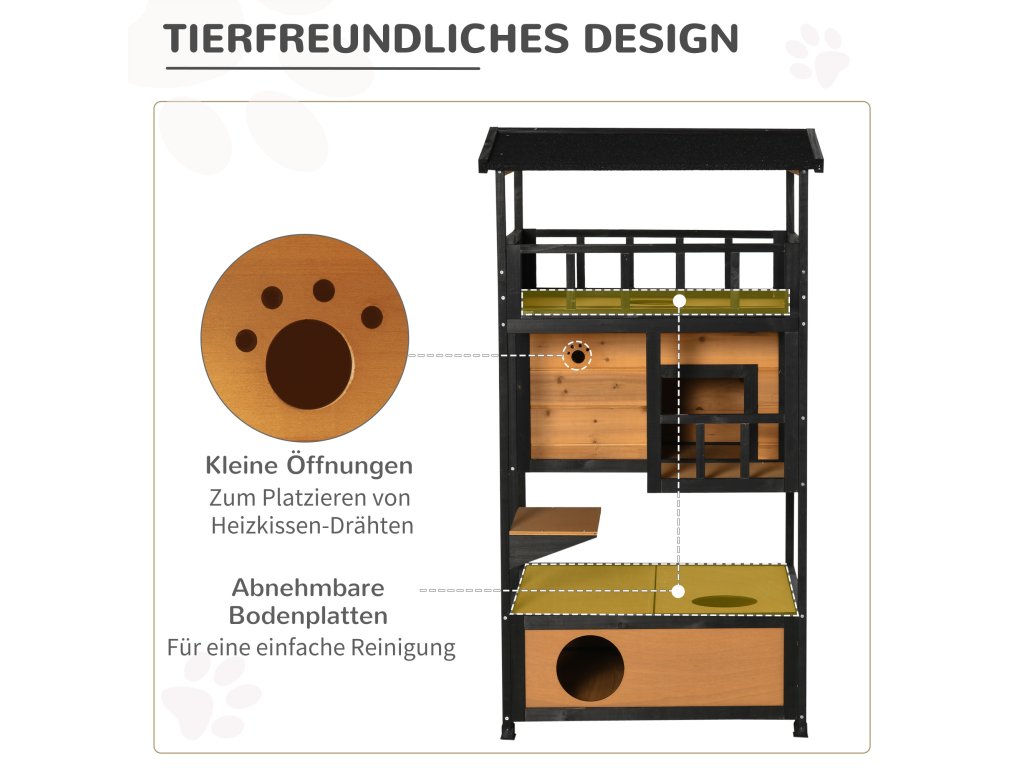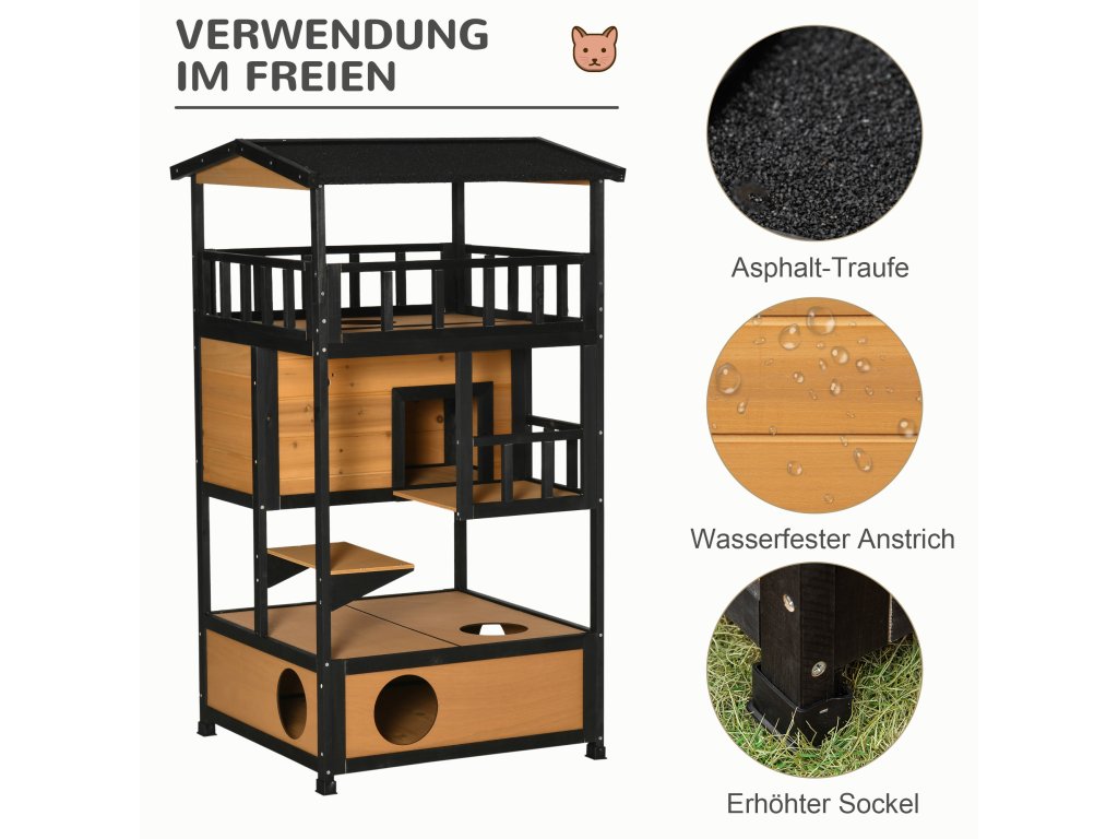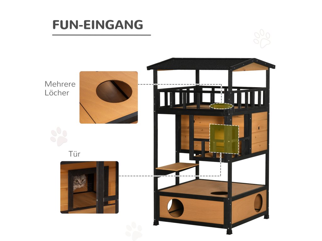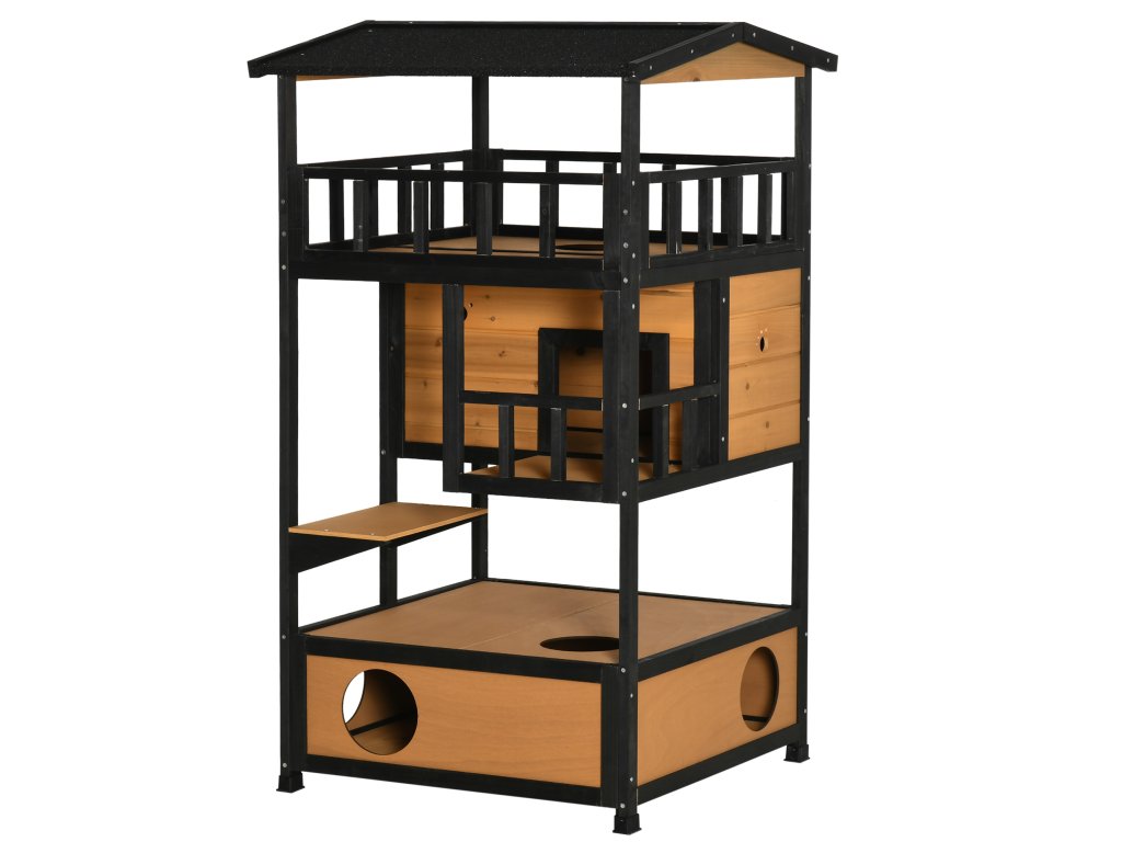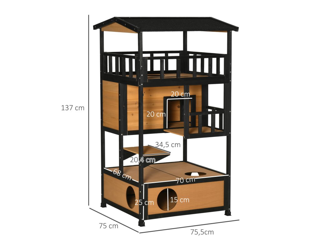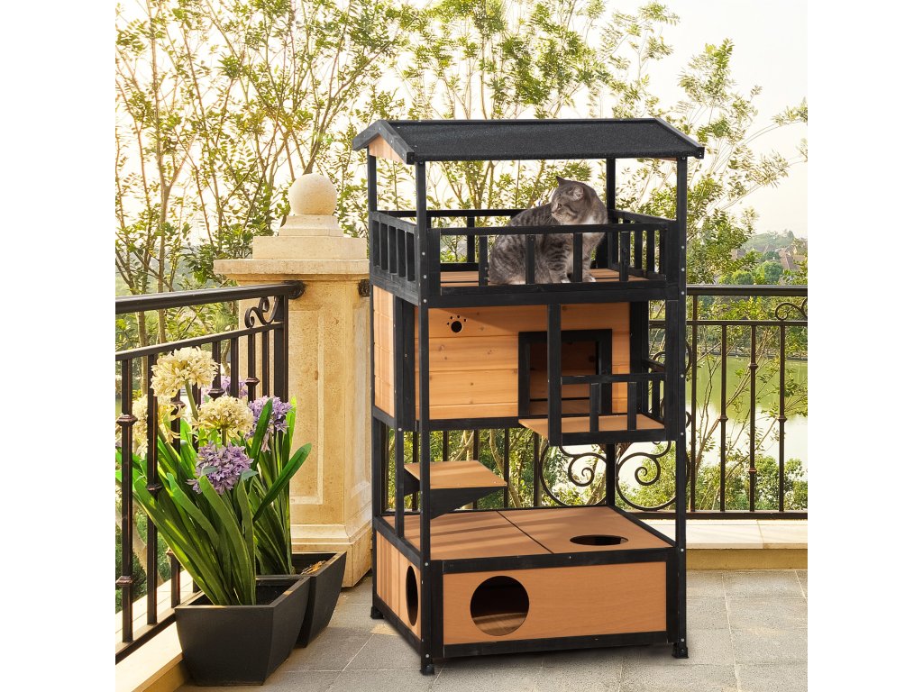 Náš čtyřpatrový kočičí domeček od Pawhut je ideální pro malé sametové tlapky. Domeček pro kočky má asfaltovou střechu a voděodolný nátěr a je tedy odolný vůči vodě a povětrnostním vlivům. Dům má tři kočičí jeskyně, skákací plošiny, dveře a zábavný vchod pro vaši kočku. Do spodní dutiny lze umístit podestýlku. Tento kočičí domeček je skvělým domovem pro vaše kočky.