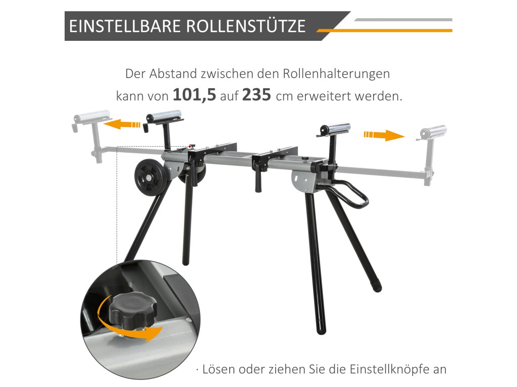 - Plně nastavitelný: Při práci s většími obrobky lze vzdálenost mezi 2 válečkovými podpěrami prodloužit od 101,5 do 235 cm povolením nebo utažením nastavovacích knoflíků. Jejich výšku lze rovněž nastavit podle vašich pracovních požadavků. Jednu z nohou stativu lze nastavit pro zajištění stability.
