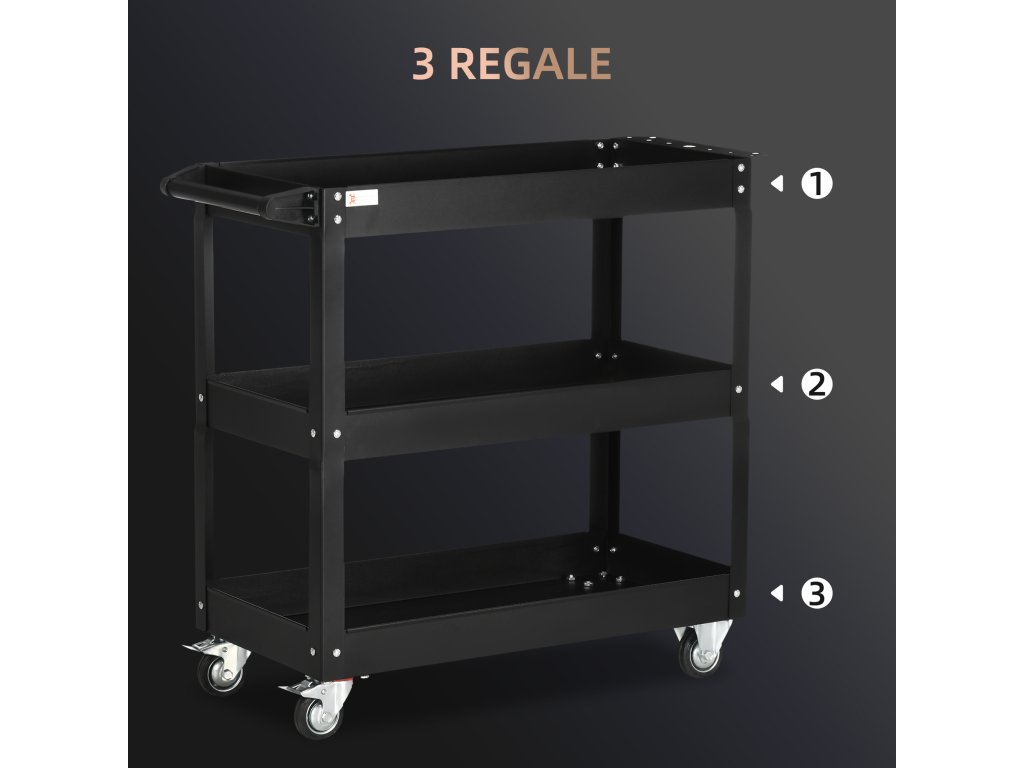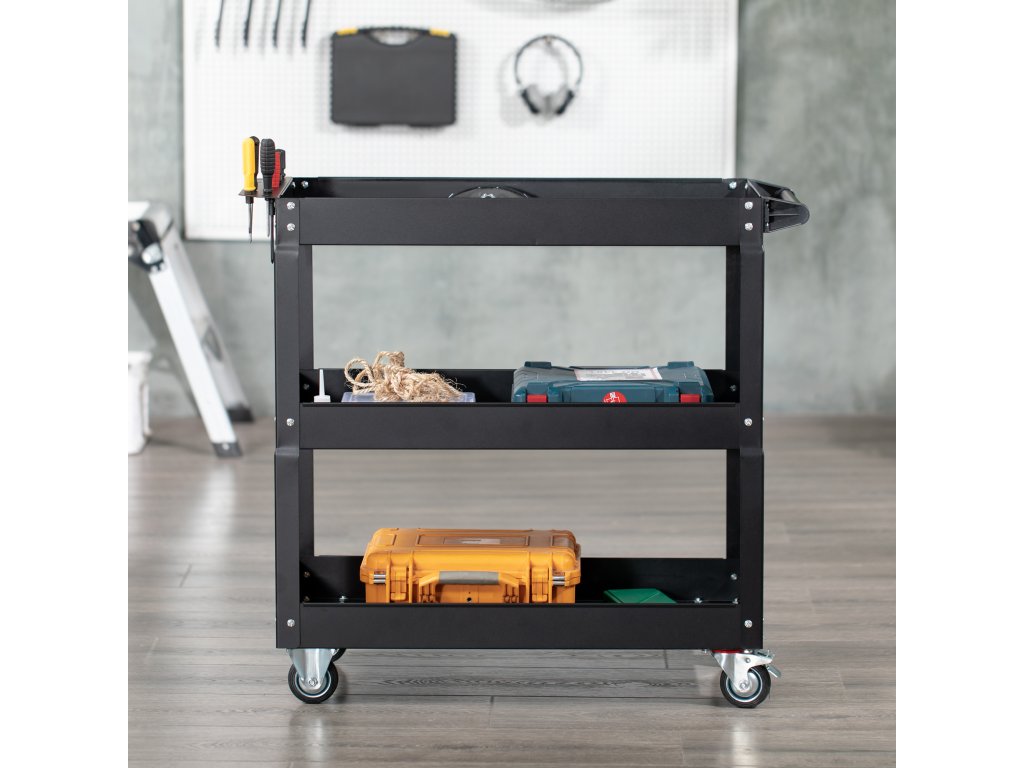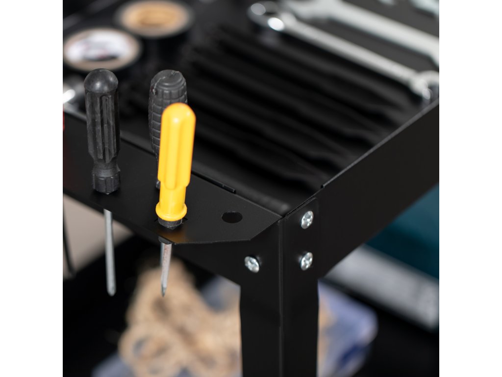 - tříúrovňové police: Tento funkční servisní vozík má tři úrovně, které jsou ideální pro organizované uložení nejrůznějšího nářadí. Přeprava těžkých břemen bez pomoci je nyní minulostí.