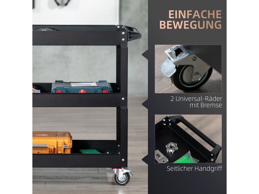 - Všestranné použití: Ať už v garáži, ve skladu, dílně nebo opravně - tento ocelový servisní vozík lze použít kdekoli. Jeho kompaktní konstrukce je obzvláště výhodná pro malé prostory, jako jsou byty, ideální pro uložení knih, nářadí a mnoho dalšího.