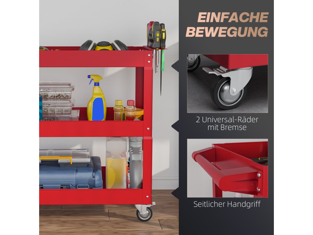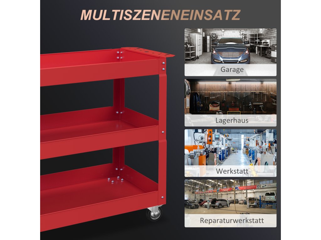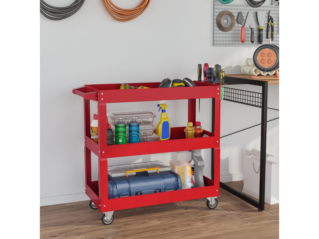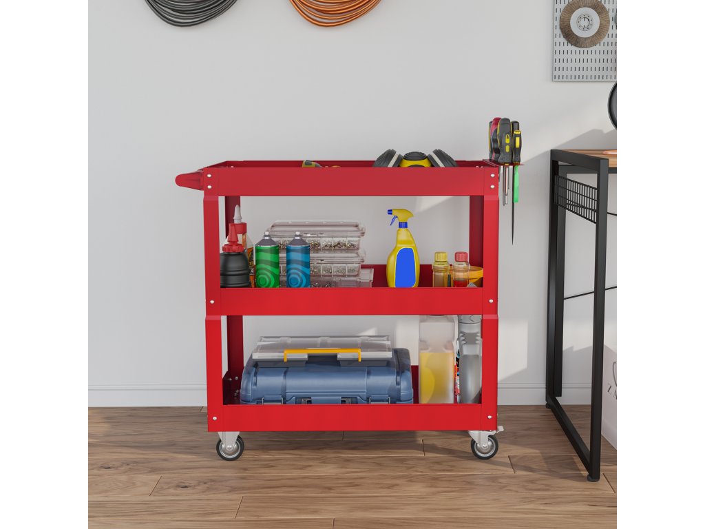 - Všestranné použití: Ať už v garáži, ve skladu, dílně nebo opravně - tento ocelový servisní vozík lze použít kdekoli. Jeho kompaktní konstrukce je obzvláště výhodná pro malé prostory, jako jsou byty, ideální pro uložení knih, nářadí a mnoho dalšího.