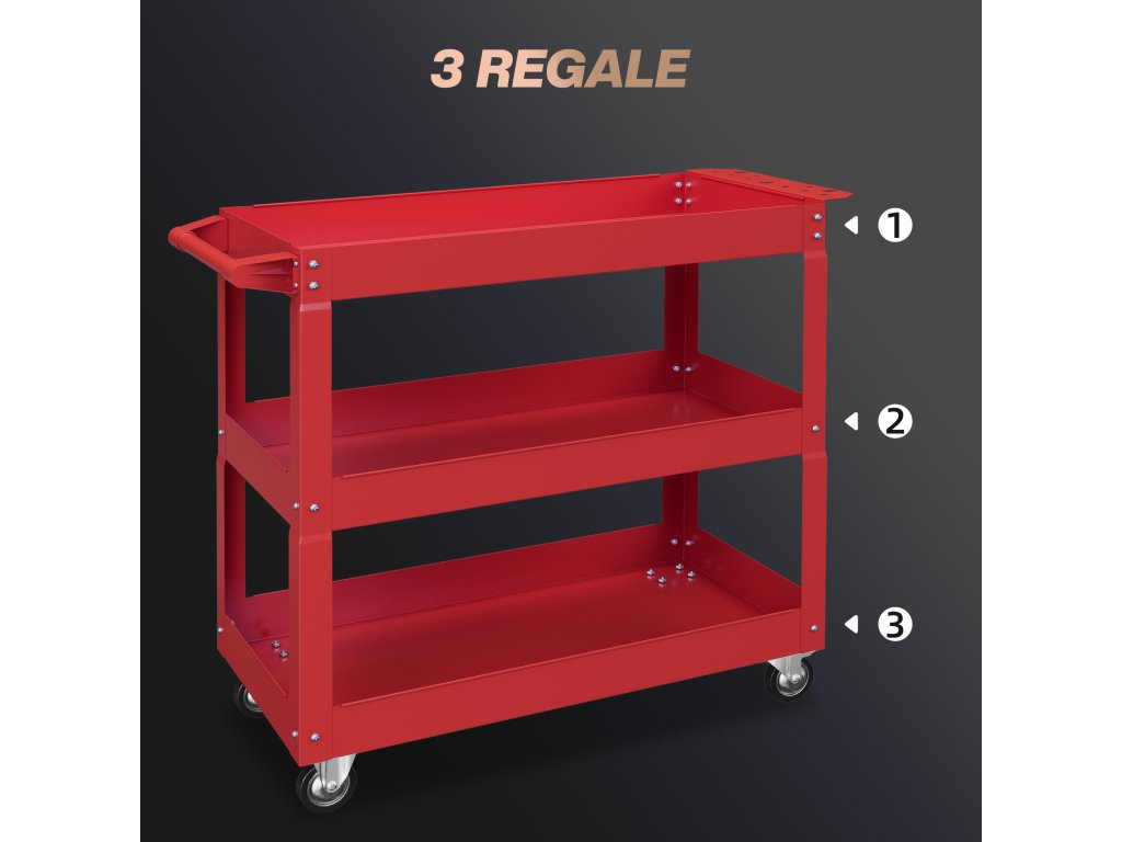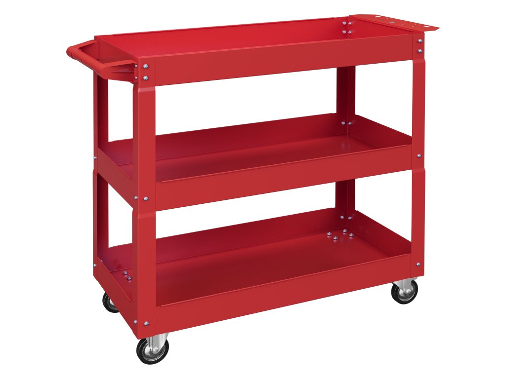 - tříúrovňové police: Tento funkční servisní vozík má tři úrovně, které jsou ideální pro organizované uložení nejrůznějšího nářadí. Přeprava těžkých břemen bez pomoci je nyní minulostí.