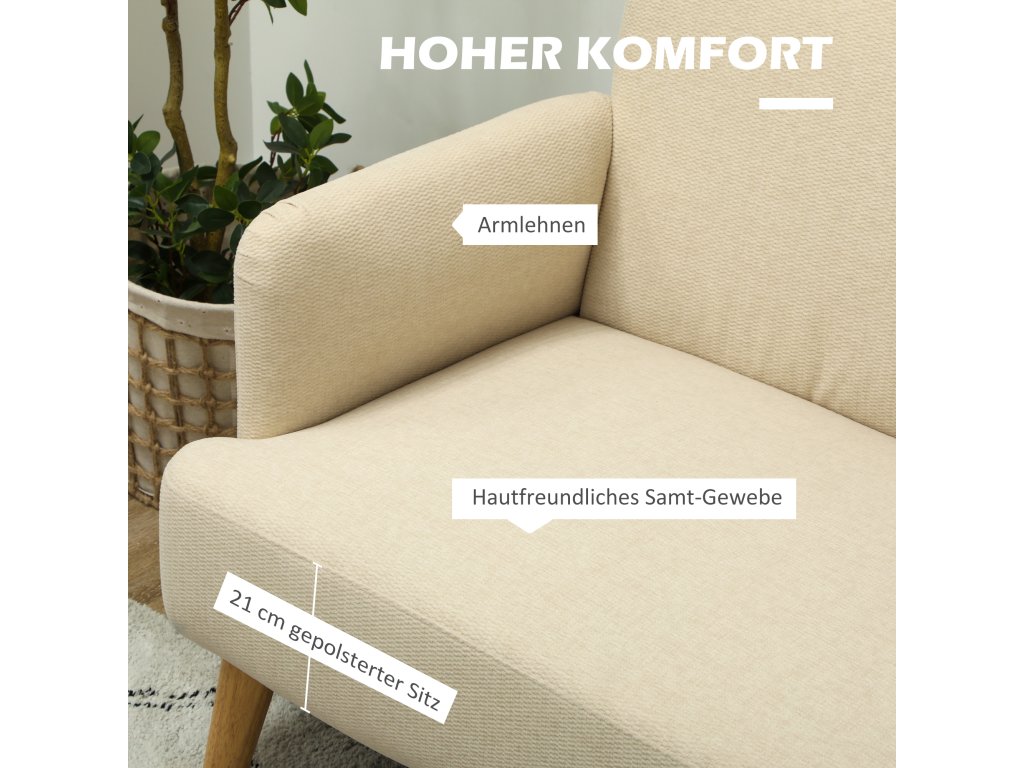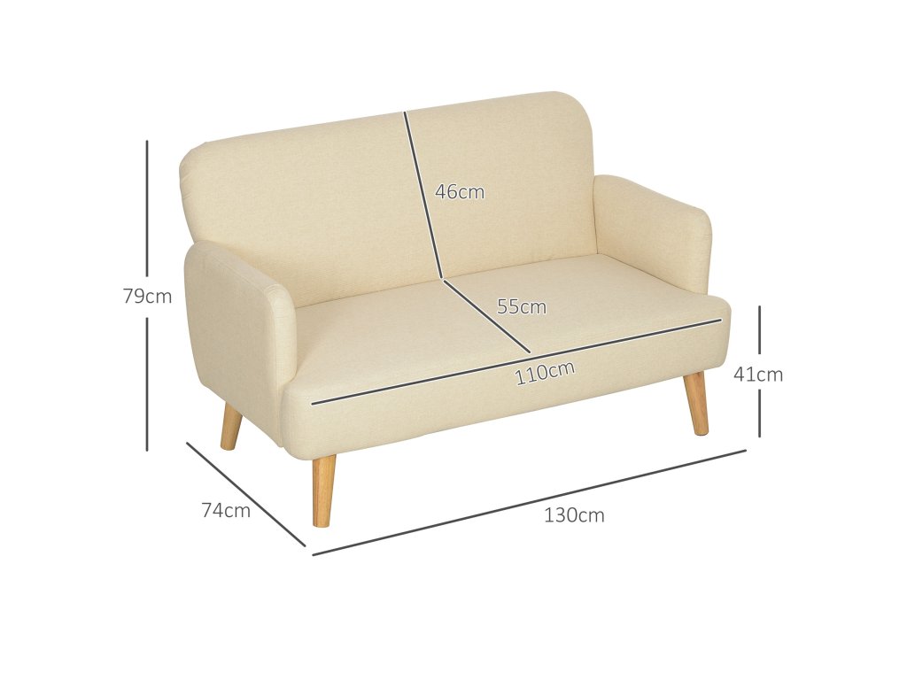 Zažijte maximální pohodlí s malou pohovkou HOMCOM - dokonalou kombinací stylu a funkčnosti pro kompaktní prostory. Luxusně čalouněný sedák o výšce 21 cm a opěrné područky vybízejí k odpočinku. Potah z látky šetrné k pokožce malé pohovky zajišťuje pohodlné sezení. Díky elegantním nohám z kaučukového dřeva, které unesou až 240 kg, bude tato pohovka stylovou ozdobou vašeho obývacího pokoje nebo kanceláře.