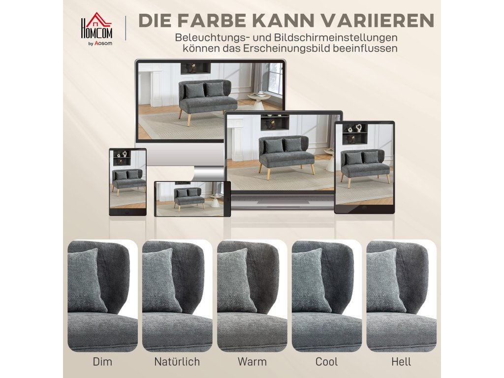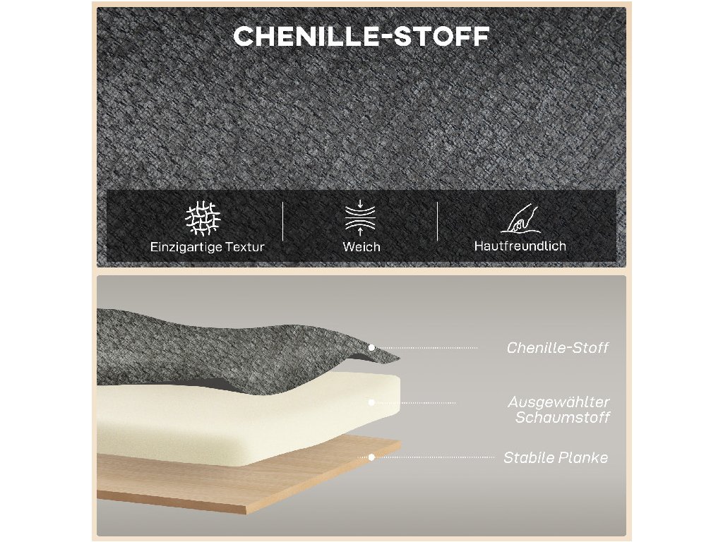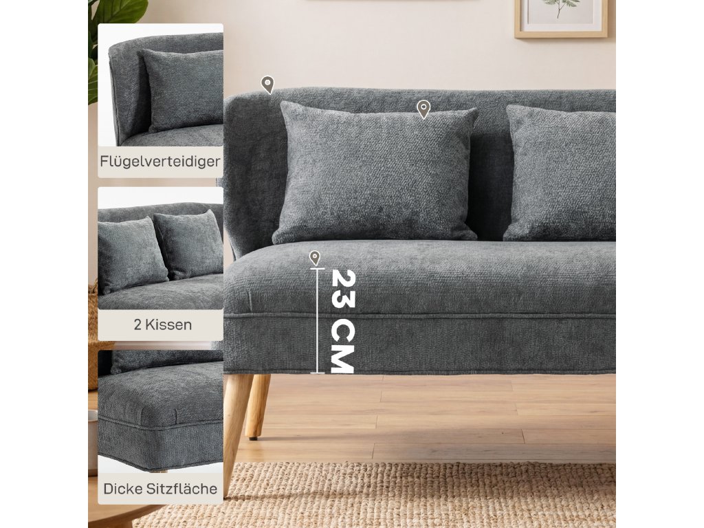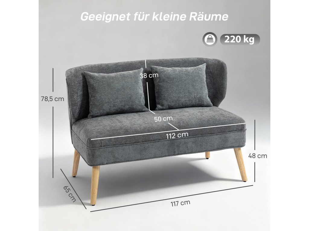 Zútulněte si obytný prostor s dvoumístnou pohovkou HOMCOM! Díky svým kompaktním rozměrům, pouhých 117 cm na šířku, je ideální do malých bytů nebo ateliérů. Silný sedák s pěnovým polstrováním a měkkým žinylkovým čalouněním vás zve na filmové večery a uvolněné rozhovory. Díky designu s křídly a robustním nohám z kaučukovníku pohovka elegantně kombinuje pohodlí, styl a odolnost.