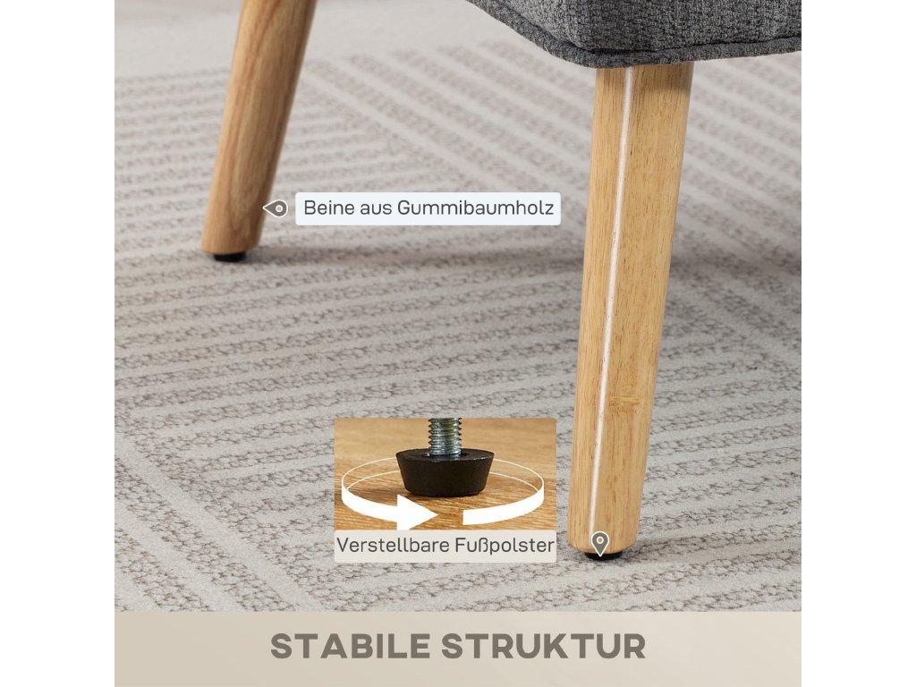 Zesílené dřevěné nohy: Robustní vícevrstvý dřevěný rám a nohy z kaučukovníku této dvoumístné pohovky zajišťují odolnost. Nastavitelné opěrky nohou vyrovnávají nerovnosti podlahy a poskytují stabilitu.