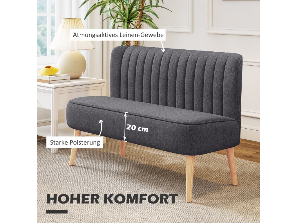 Ponořte se do pohodlí této elegantní dvoumístné pohovky od HOMCOM – ideálního útočiště pro filmové večery nebo odpočinkové drinky s přáteli. Tato kompaktní pohovka s charakterem promění každou místnost ve stylový salonek. Prostorné a pohodlné sedátko vás vybízí k odpočinku, zatímco robustní dřevěný rám zajišťuje stabilitu a odolnost. Snadno udržovatelné látkové čalounění a měkké polstrování vám umožní pohodlně se uvolnit a odpočinout si po dlouhém dni.