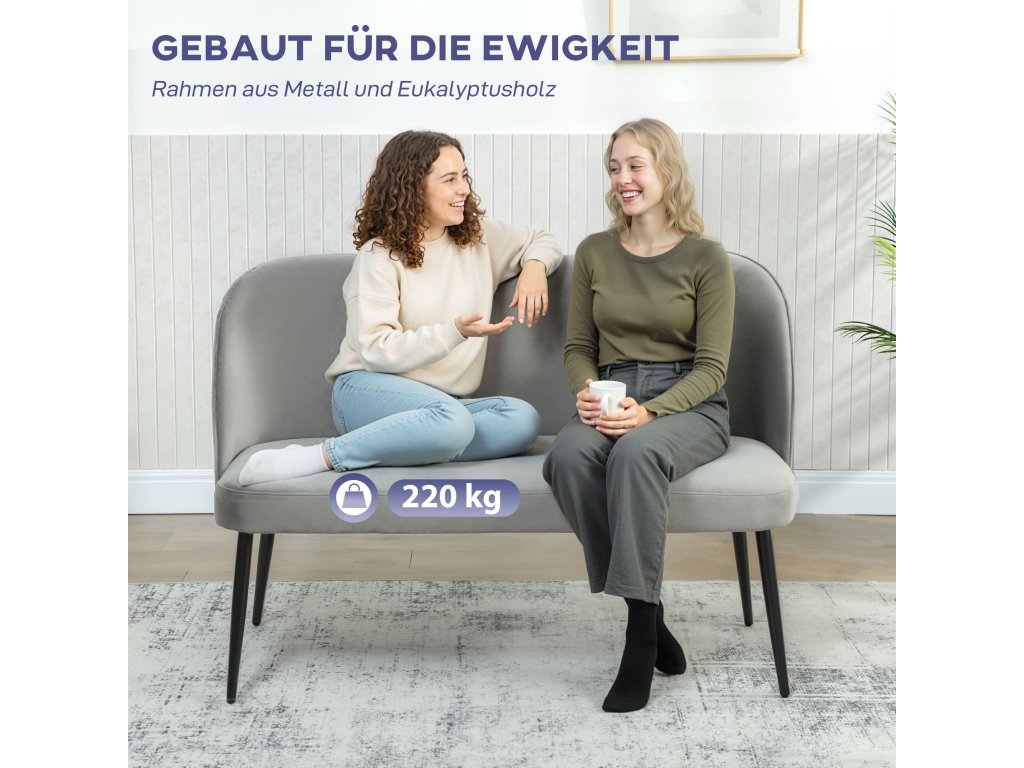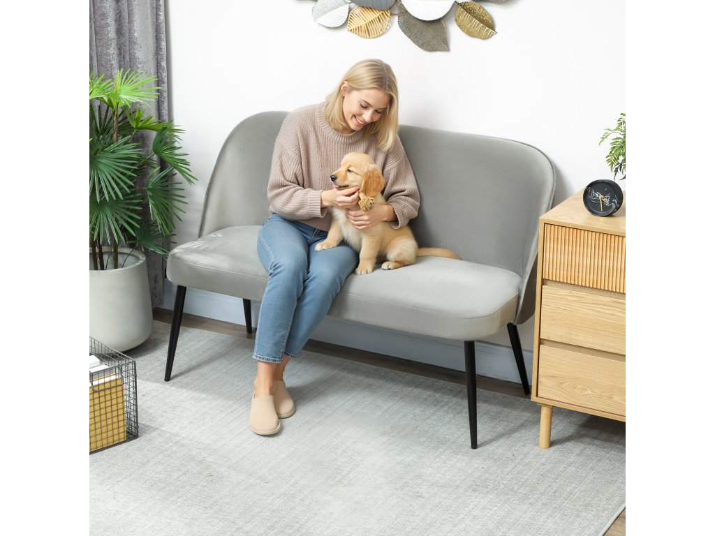 Dvoumístná pohovka HOMCOM, moderní čalouněná pohovka s kovovým a dřevěným rámem, potah ze sametové látky, šedá barva