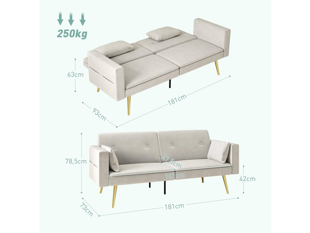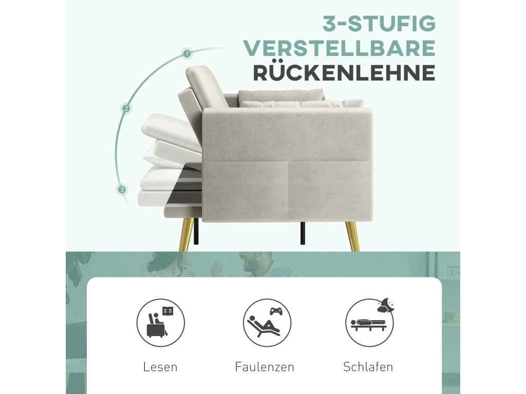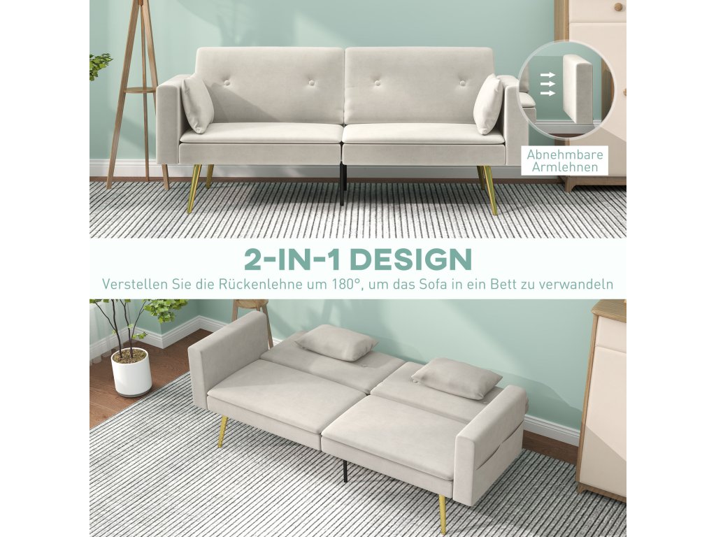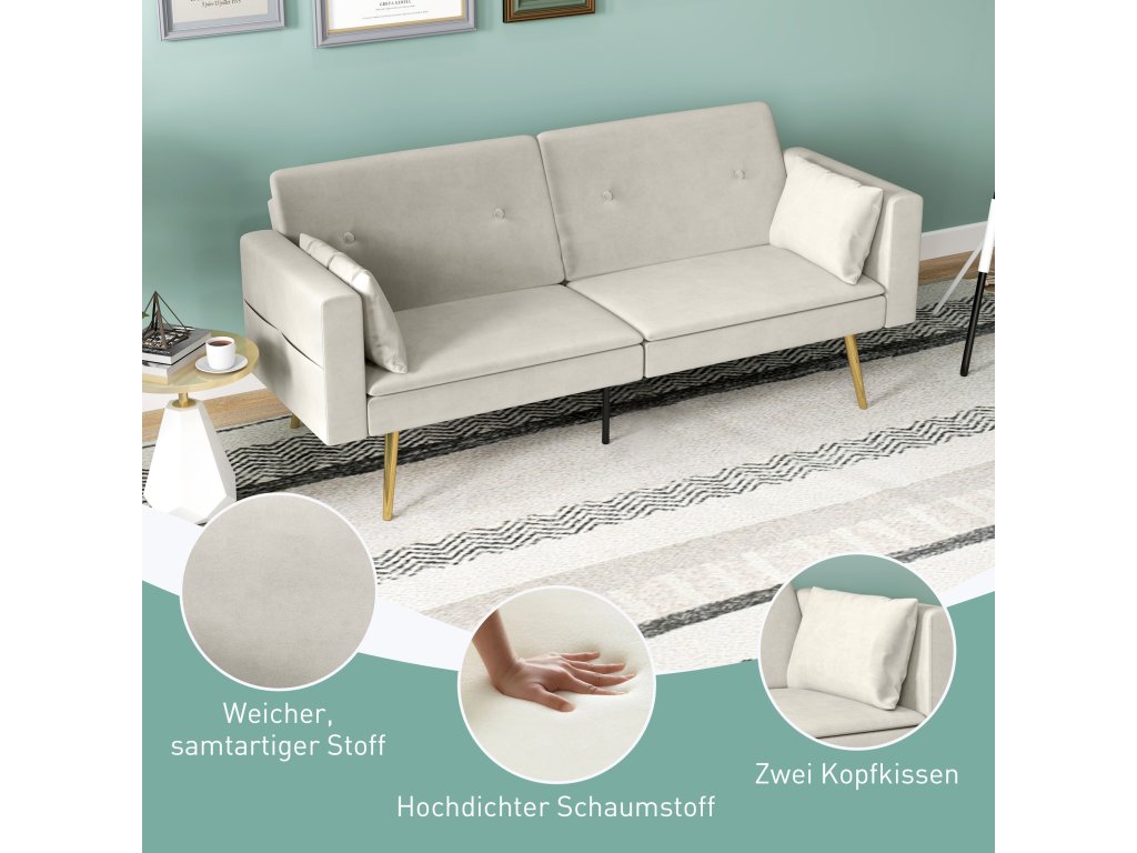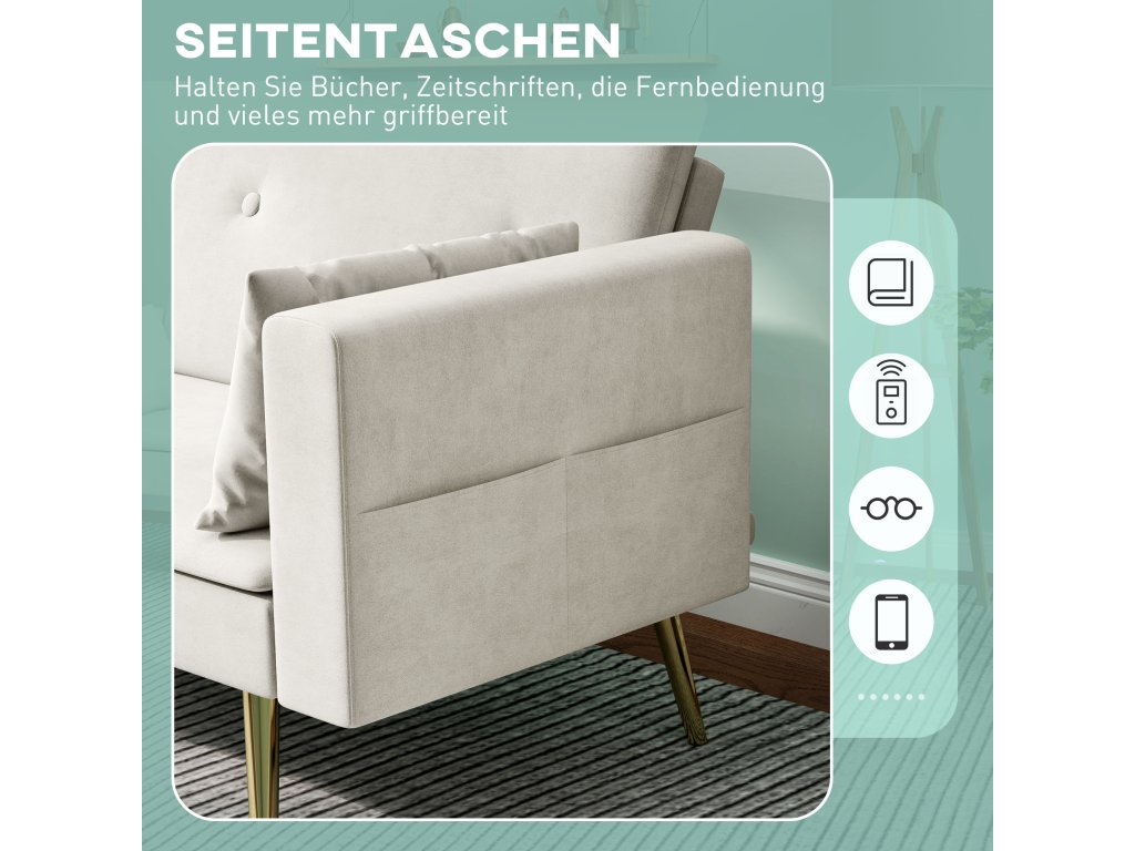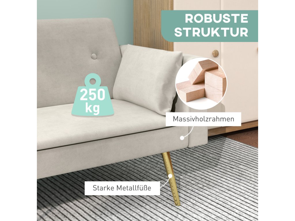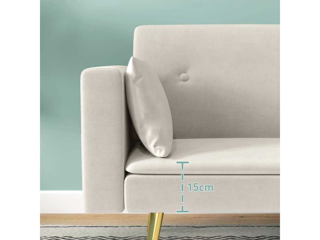Dvoumístná rozkládací pohovka HOMCOM, polohovatelné opěradlo, měkké polštáře, sametový potah, do obývacího pokoje, pokoj pro hosty, béžová barva