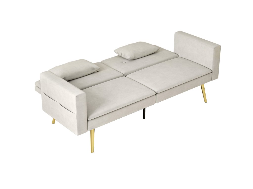 - Rozkládací pohovka: Snadno rozkládací pohovka s lehací plochou 160L x 93B cm, včetně odnímatelných područek pro efektivní využití prostoru v malých obytných prostorech nebo pokojích pro hosty