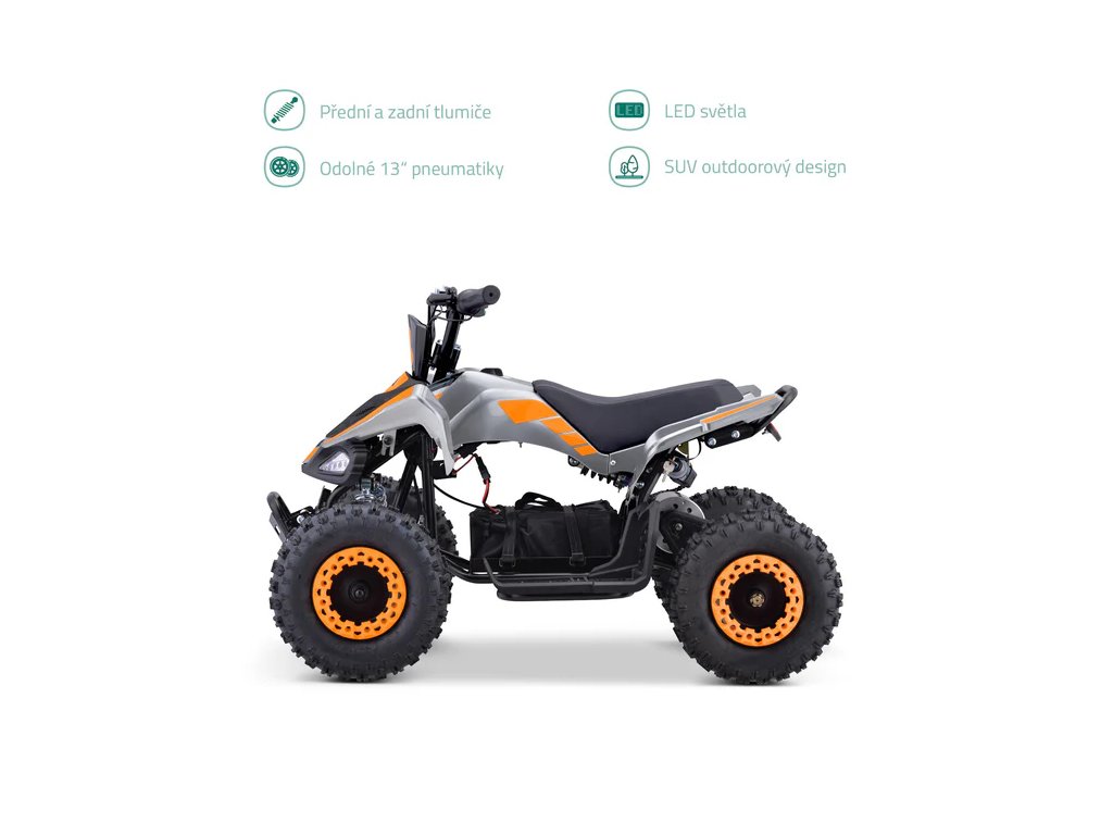 Díky kompaktním rozměrům hodíte čtyřkolku v klidu do kufru a víkendová jízda na chalupě může začít. Třináctipalcové pneumatiky zvládnou víc než hladký asfalt. Štěrk? Terén? Není problém. Extra vyztužený pláště přenesou defekty mimo váš slovník. Děti rostou? Mění se povrch? Probuďte v sobě mechanika a pohrajte si s tuhostí nastavitelných tlumičů, vaše dítko bude koukat! Naopak spolehlivá 12 Ah baterka a pohon žádnou údržbu nepotřebujou a zaručí dojezd až 20 km i hodinu a půl srandy.