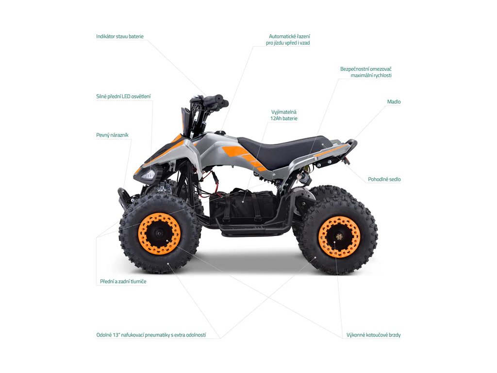 Valit maximálkou 25 km/h? To je pro juniory pořádnej fičák! Žádný strachy, zodpovědní rodiče můžou klíčem nastavit tři rychlostní stupně a začít zvolna. 800W motor je díky nízké váze dětí raketa a doveze vaše potomky i na největší kopec v okolí. A jak dolů? Přední i zadní kotoučovky jsou citlivý a reagujou na jedničku. Pro ještě větší bezpečí jsme použili samobrzdící systém – kdykoliv potomek nepřidává plyn, čtyřkolka samovolně brzdí a zpomaluje.
