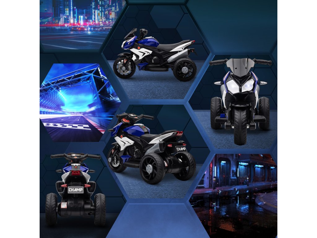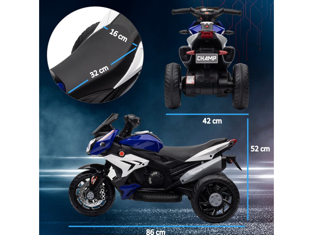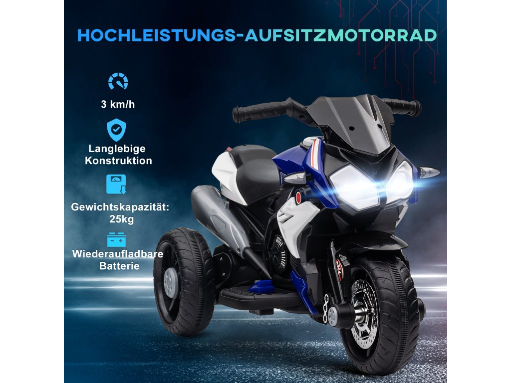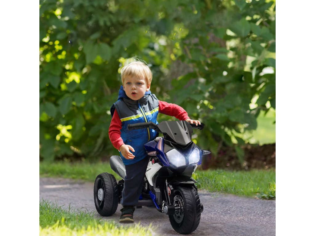 Elektrická dětská motorka HOMCOM, světla a zvuky, 3 km/h, dobíjecí, plast a kov, modrá/bílá