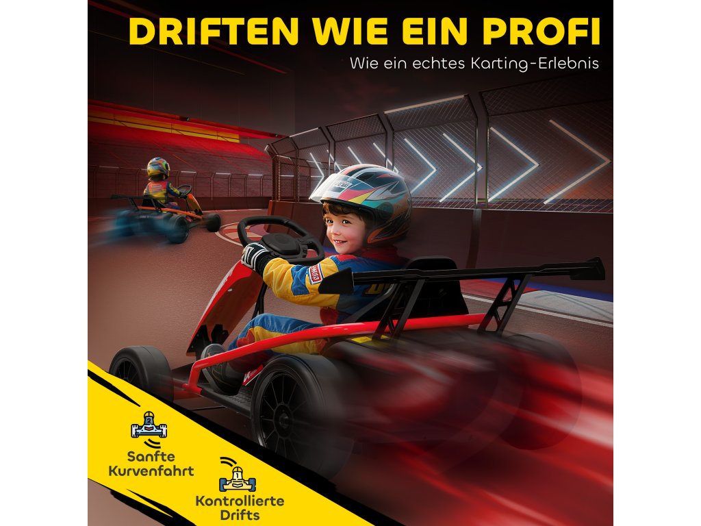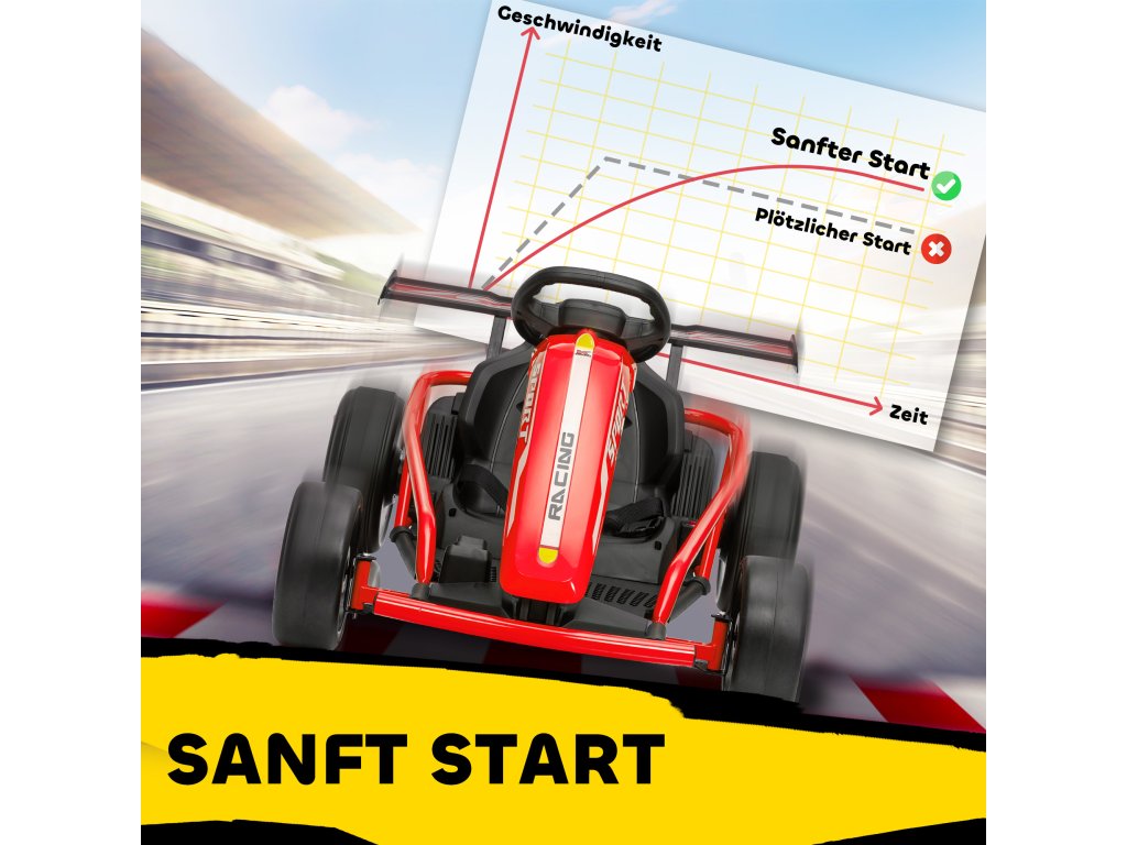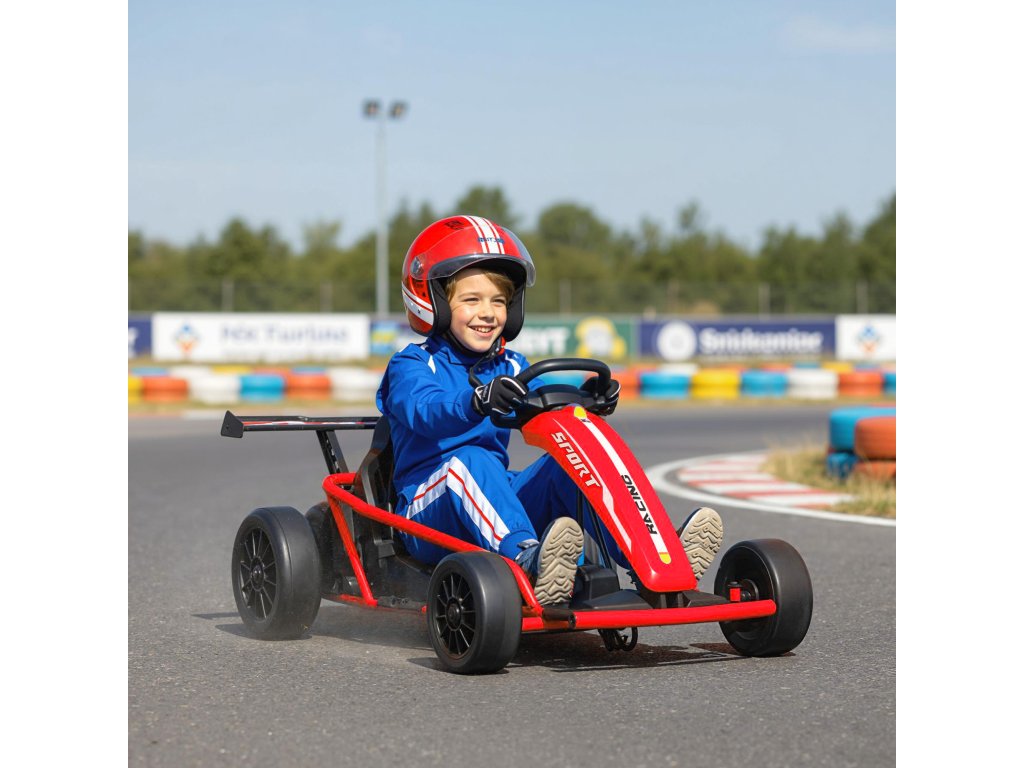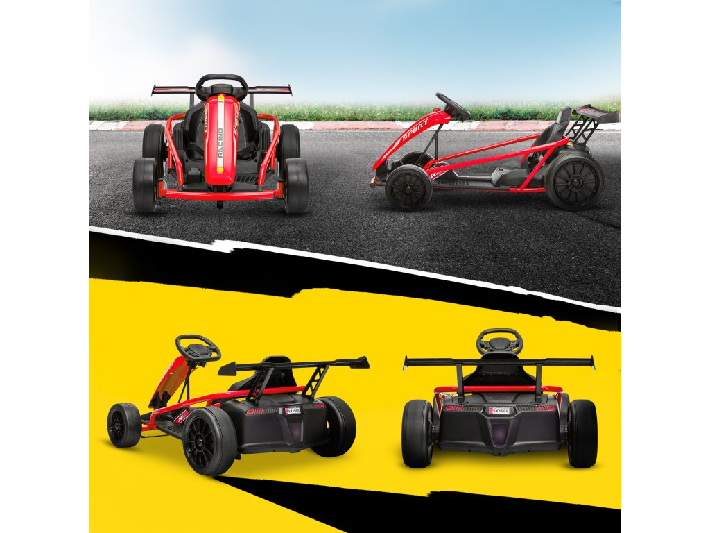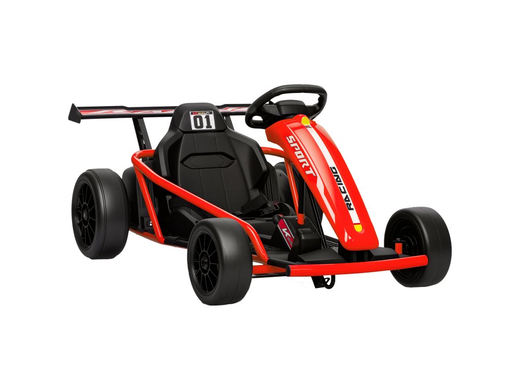Elektrická motokára 24V pro jízdu a driftování, nylonové pneumatiky, bezpečnostní pás, klakson, hudba, pro věk 8-12 let, červená