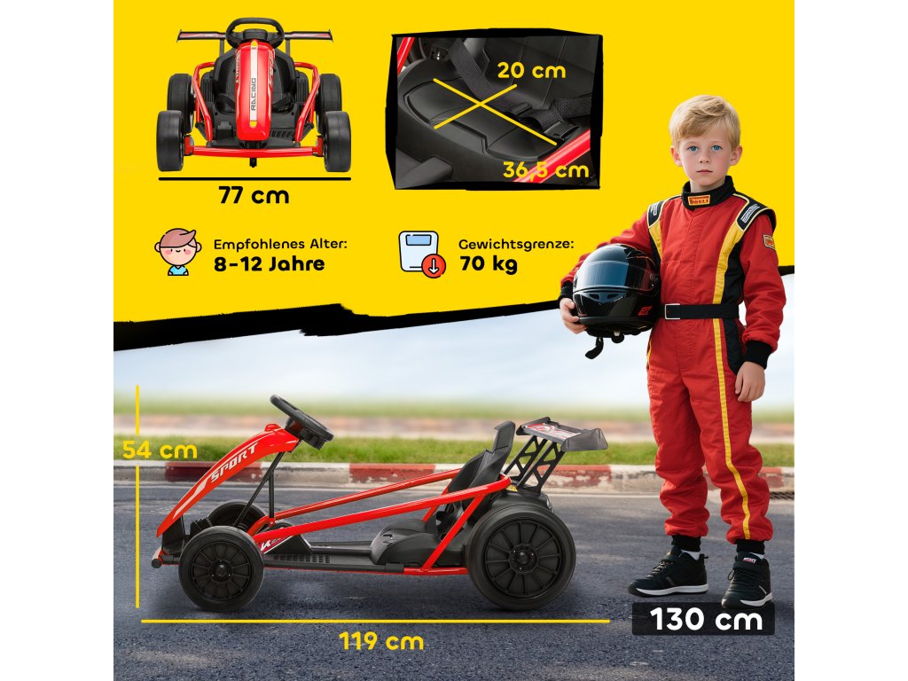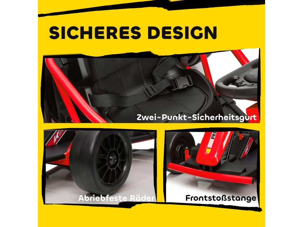 Zvýšená bezpečnost a pohodlí: Tato elektrická motokára uveze až 70 kg a má robustní skořepinu, kovový rám a přední nárazník. Sportovní sedadlo o šířce 36,5 cm s dvoubodovým pásem zajišťuje bezpečné uchycení při zatáčení a driftování.