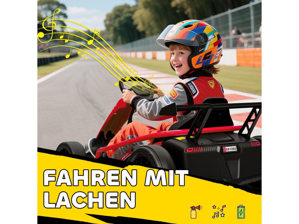 Pro skutečný závodní zážitek: Díky sportovnímu volantu, klaksonu a ovládání hudby nabízí tato elektrická motokára interaktivní zábavu z jízdy. Děti se mohou vžít do role skutečných závodních jezdců a zažít vzrušující dobrodružství.