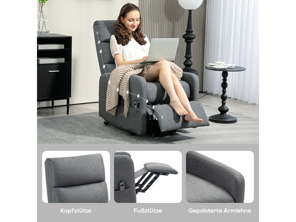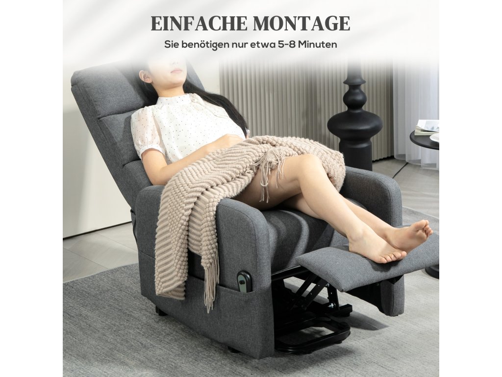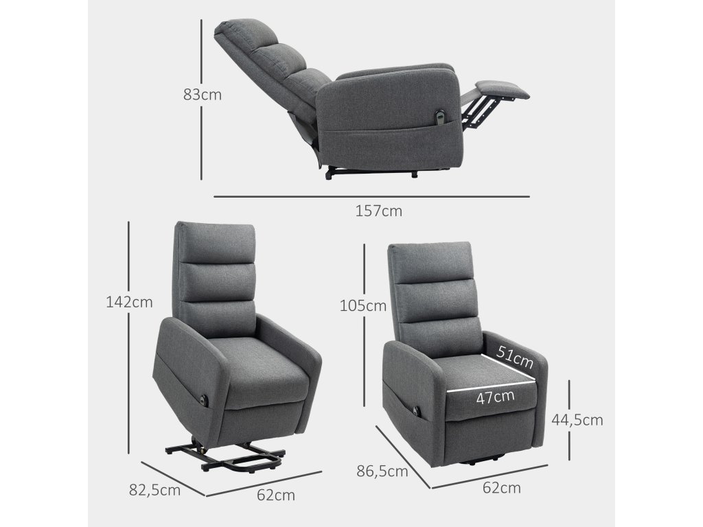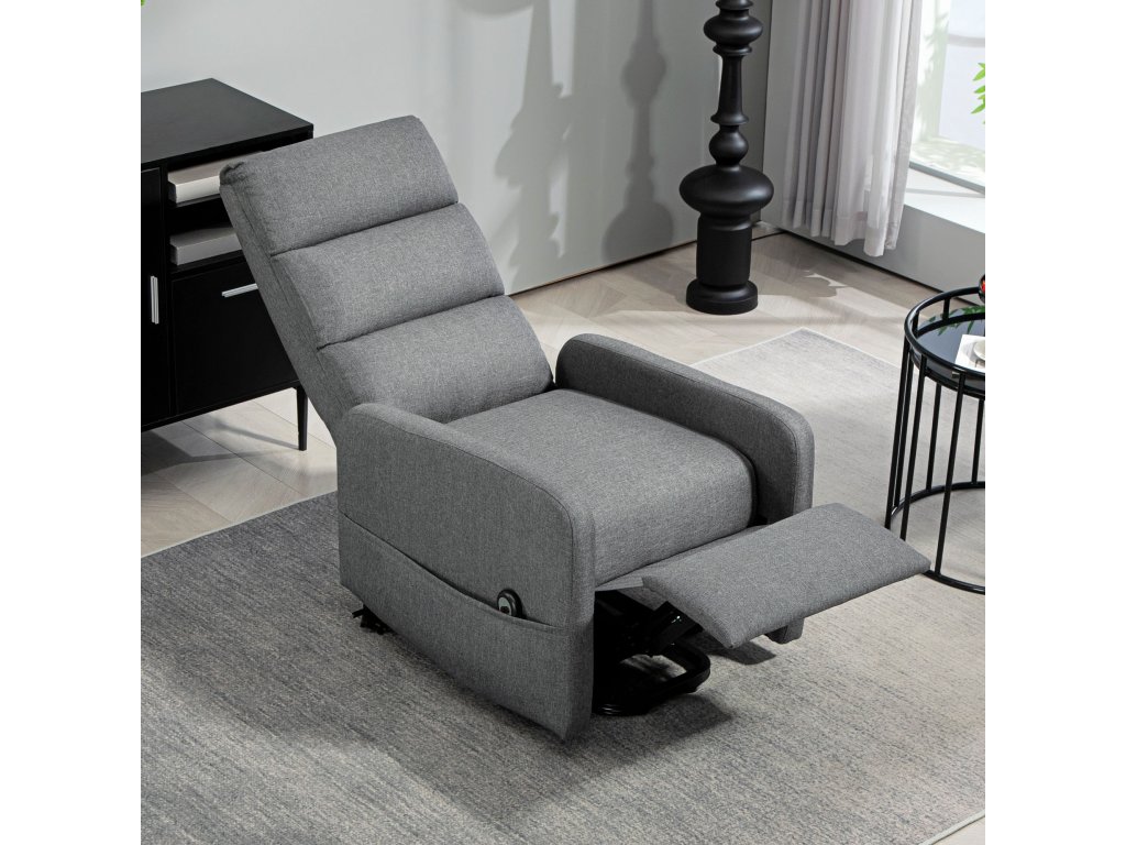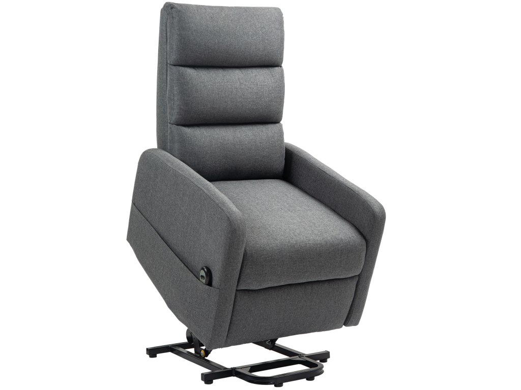 Elektrické polohovací křeslo HOMCOM s asistencí zvedání, dálkové ovládání, měkká pěna, boční kapsa, potah s imitací lnu, šedá