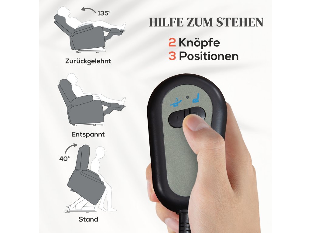 Snadné zvedání a naklánění: Toto polohovací křeslo s funkcí zvedání nabízí 40° náklon a plynulé naklánění. 135° poloha s elektricky ovládaným mechanismem, který bez námahy přesune uživatele do téměř stojící nebo ležící polohy.