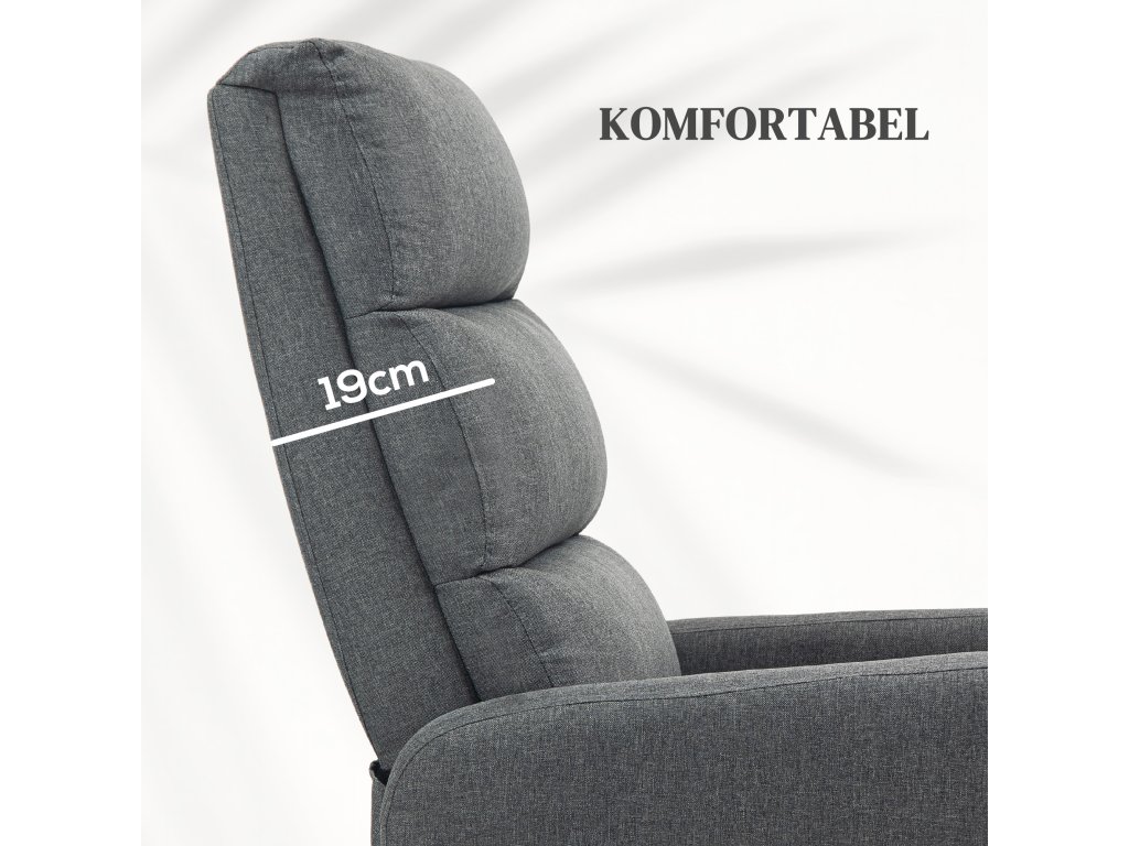 Měkké pohodlí: Toto polohovací křeslo je vybaveno jádrem z taštičkových pružin, silným polstrováním z pěny střední hustoty a prodyšným potahem, který poskytuje elastickou oporu a vynikající pohodlí.