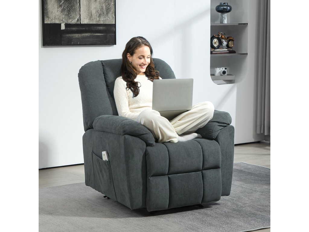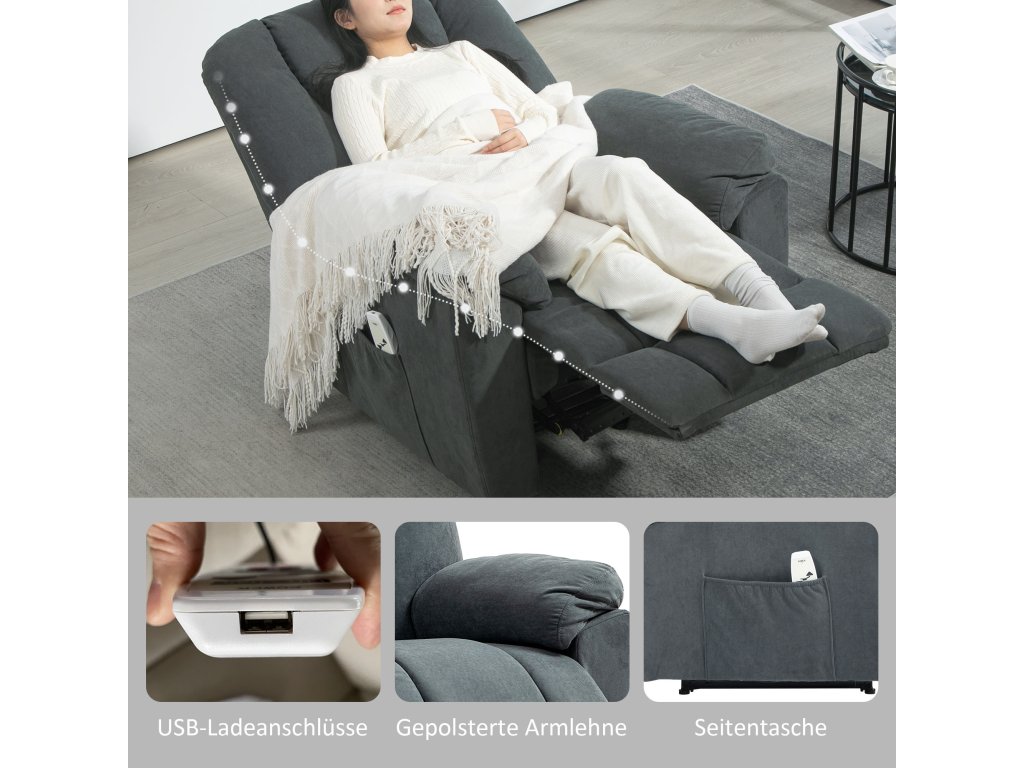 Elektrické polohovací křeslo HOMCOM s masážní a vyhřívací funkcí, čalouněné křeslo s USB portem, boční kapsy, šedé